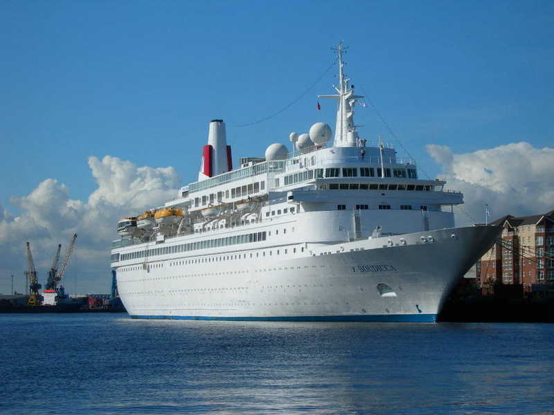 Arklow Fame at anchor offshore, notice the bloody big dent in her bulbous bow!