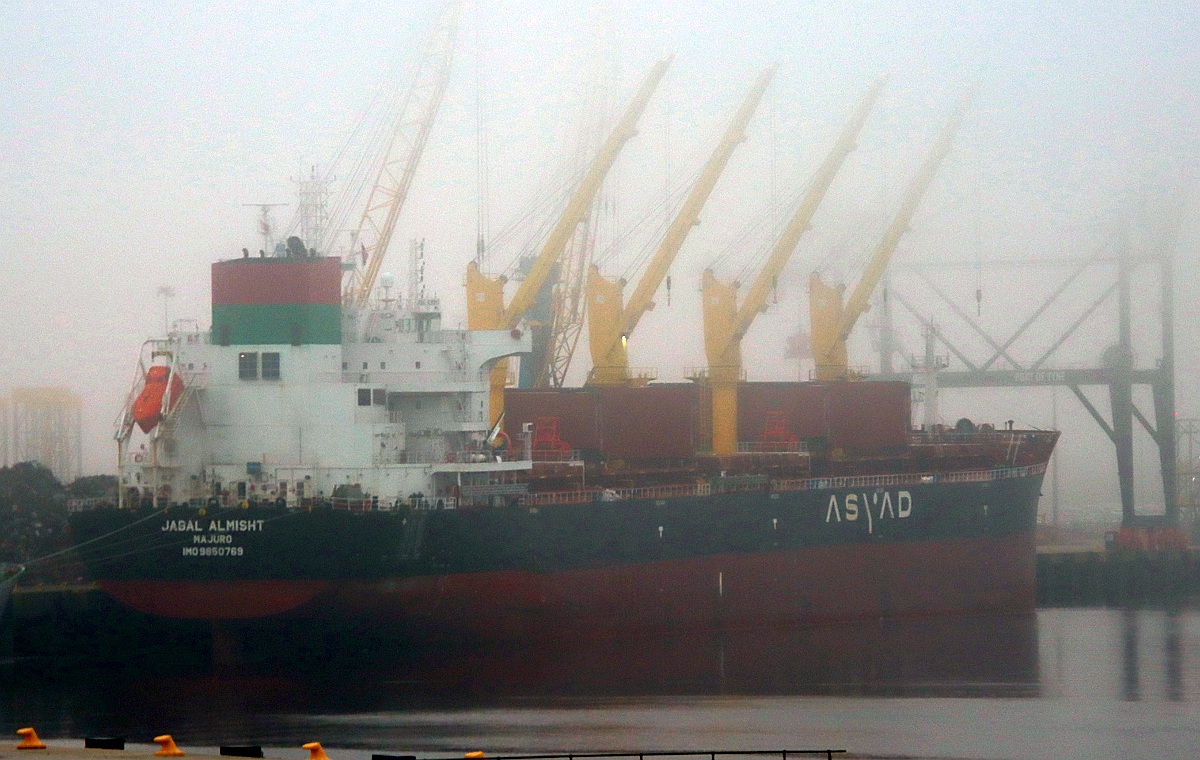 Bulk carrier JABAL ALMISHT at a foggy Riverside Quay 20/12/2025. Photo by Richard Athey.