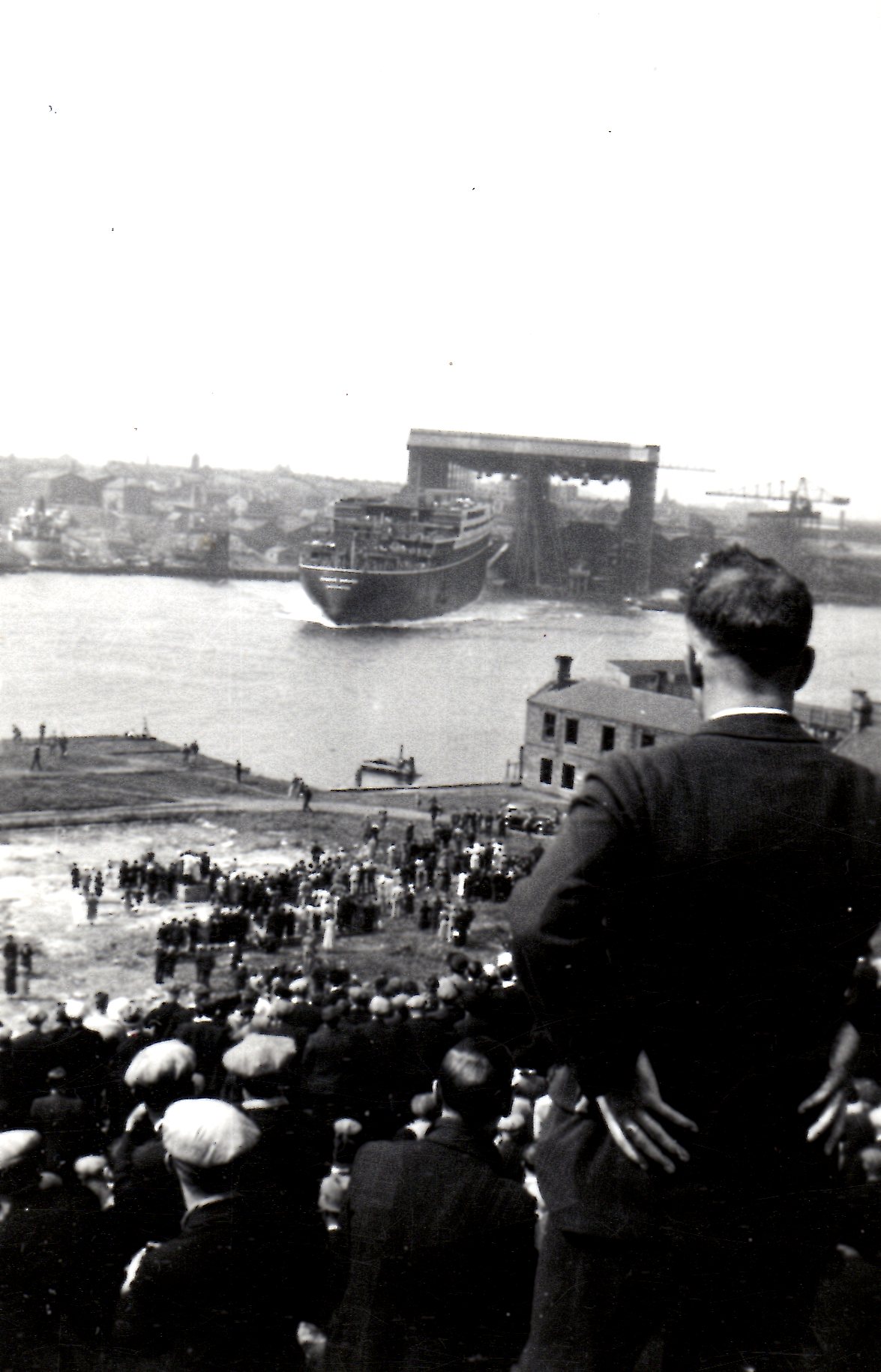 I believe the ship is being launched from Swan Hunter at Wallsend (I can see the same landmarks on the horizon to the left of the large structure as appear in other photos of this shipyard which are available on the internet), and the photo is taken from or near the Ballast Hill, Hebburn. I suspect the time period is 1945-1965, with 1950s being most likely. The name on the ship is illegible (I have tried a magnifying glass, and also scanned the photo at the highest resolution possible without success); all I can say is it has 2 words, and that the second word appears to have 7 letters (I assume the word underneath is some sort of location). If I were to guess, I would guess at British Destiny (launched 1959) but I have no idea whether or not 'my' ship is a tanker. Also do ships launch backwards?