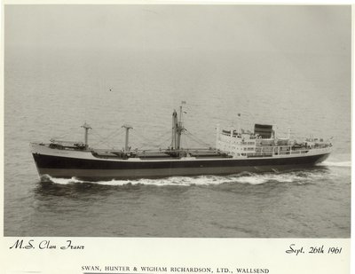 CLAN FRASER: The Clan Line Steamers Ltd., Glasgow, 9242gt, completed by Swan, Hunter & Wigham Richardson, Newcastle, 9-1961. 1965 JALAPALAKA (India), 11-1979 damaged by fire, 1982 broken up. Taken 23 August 1961.