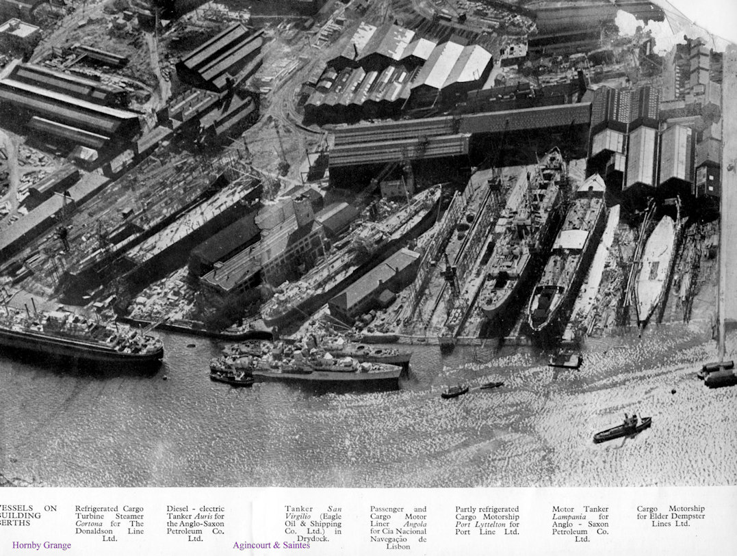 The bits that are left off this picture are:- VESSELS FITTING OUT. "Refrigerated Cargo Motorship HORNBY GRANGE for Houlder Line Ltd" and "H. M. Flotilla Leaders AGINCOURT and SAINTES for British Admiralty."