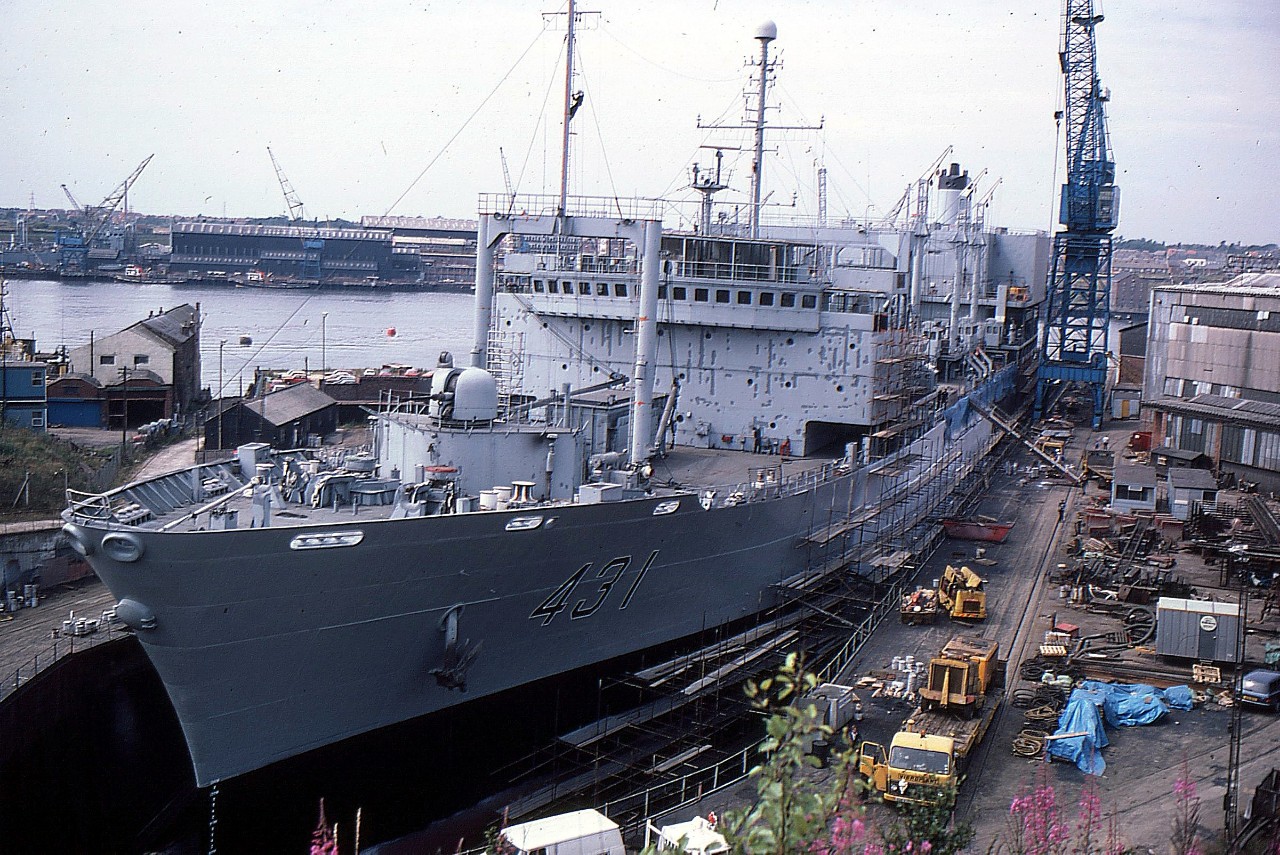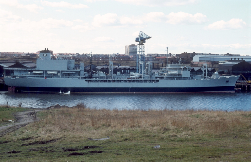 Kharg at Walker Naval Yard on 7 April 1980, a few days before handover. The export licence was withrawn on the morning of the handover and she remained on the river until 1984, when she was finally released after removal of the 76mm gun seen at the bow and other items of armament.