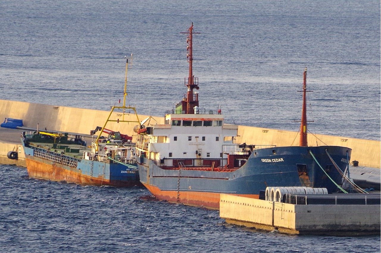 GREEN CEDAR Ex Luminence Built Clelands Yard No 336 looking laid up on the outer wall of Cartegena 21.05.17,lying astern of her is the MUNGO Ex Tarquence.