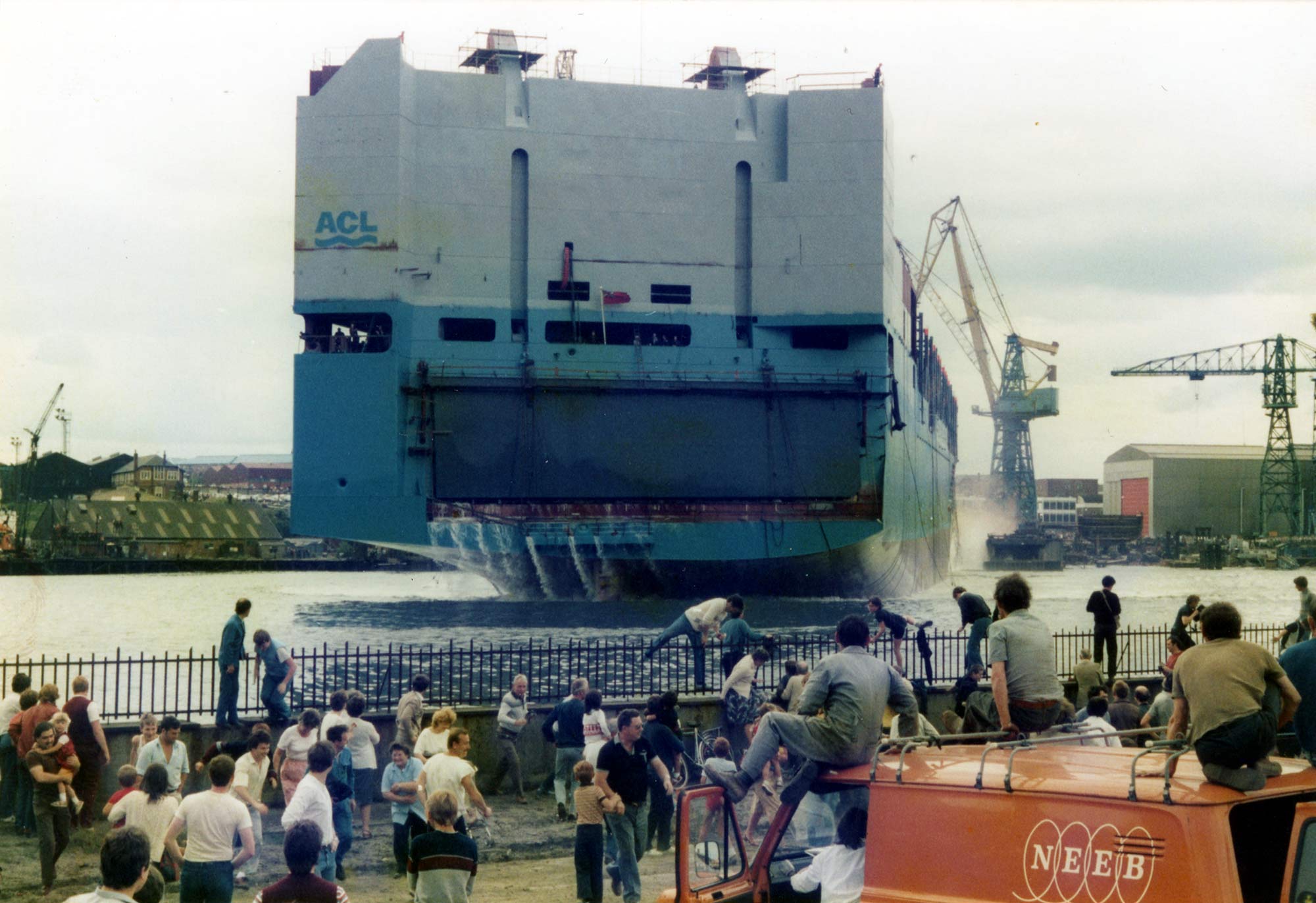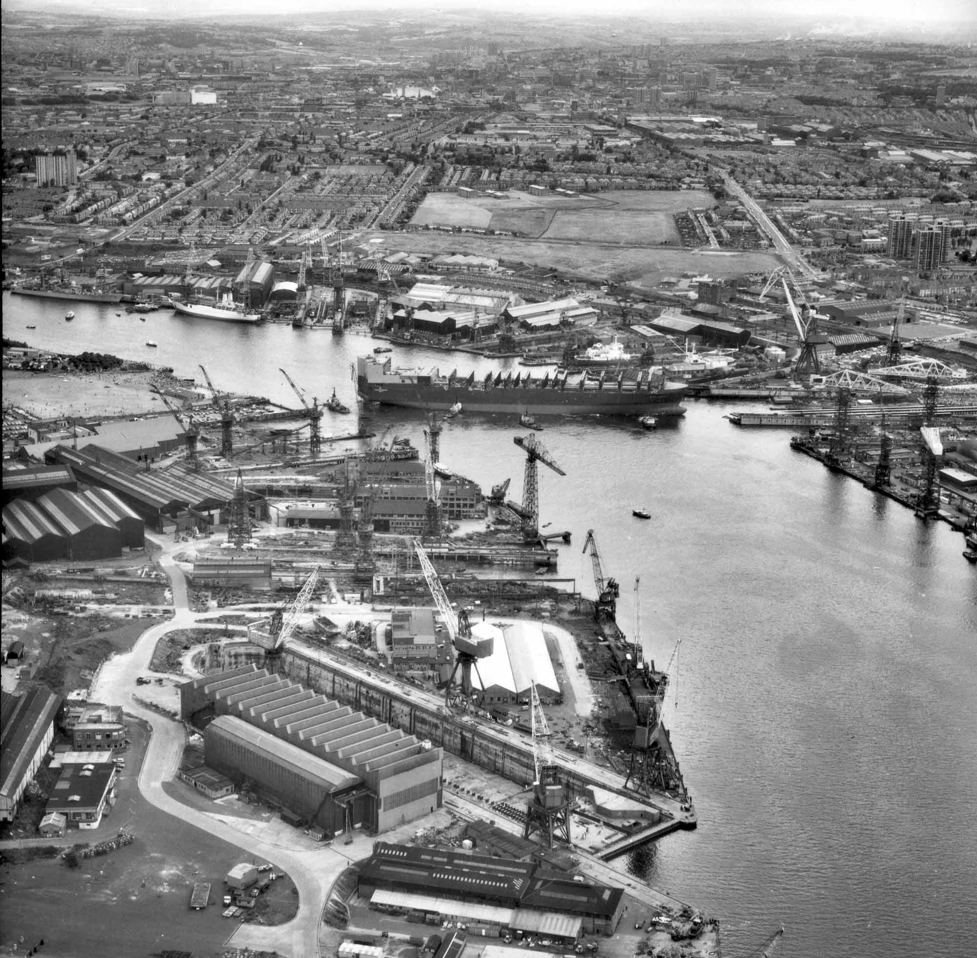 In the aerial view note the structures just inside the gate at Hebburn Dock. The two blocks were the upper blocks of Atlantic Conveyor's superstructure including the wheel house, to the right hand side of the dock. The blocks were erected by a large floating sheerlegs a few weeks after launch.