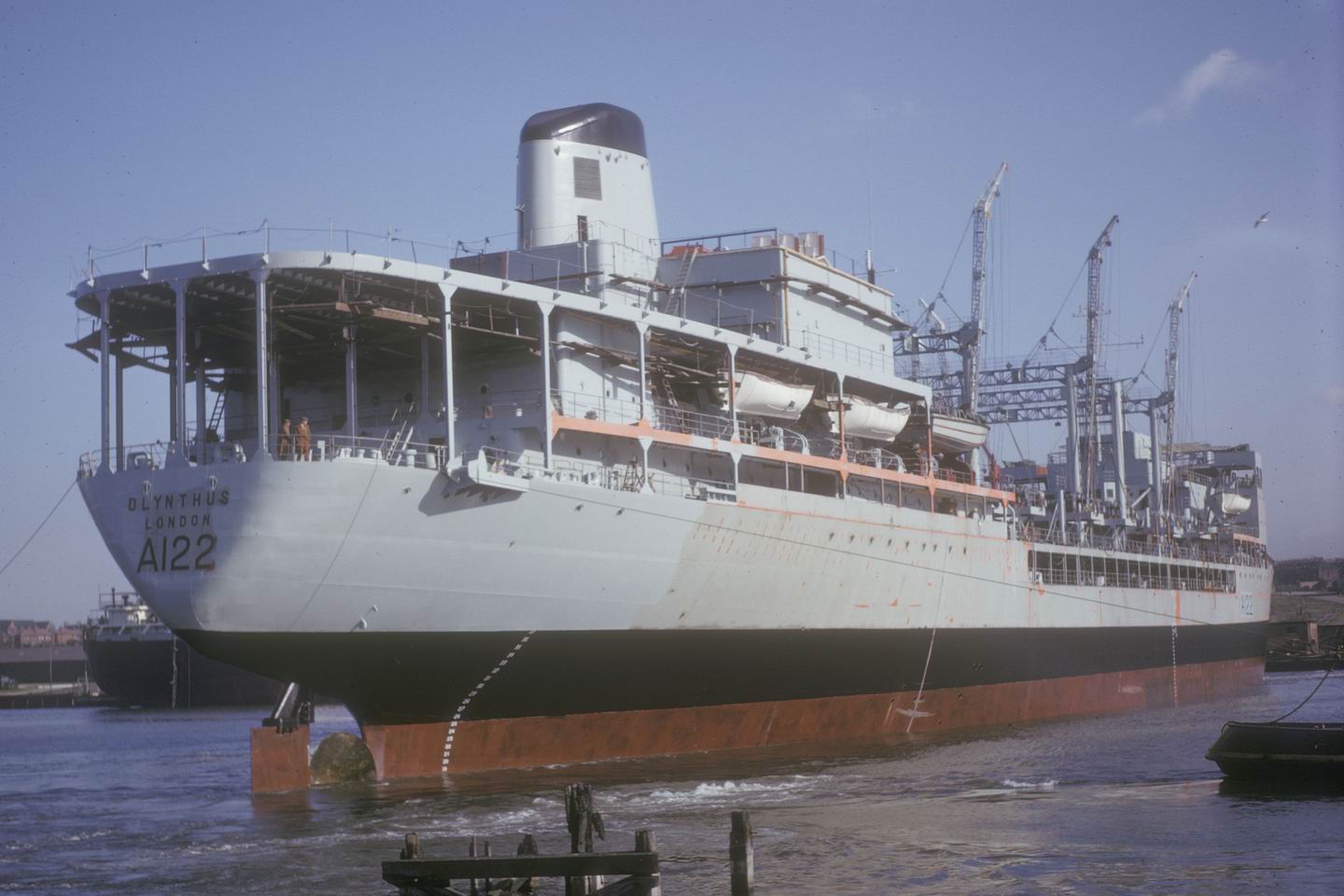Olynthus being undocked at Hebburn on 18 May 1965, she was launched 10 July 1964 and renamed Olwen in 1967 to avoid confussion with the submarine HMS Olympus.