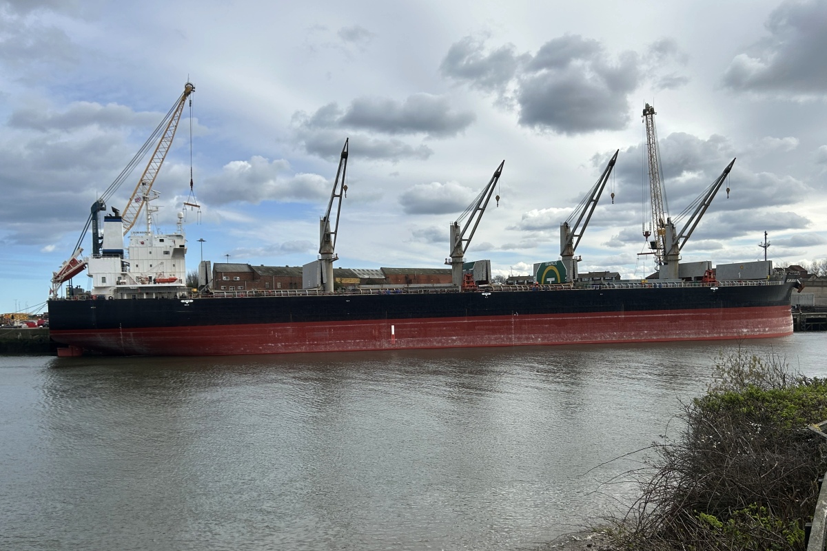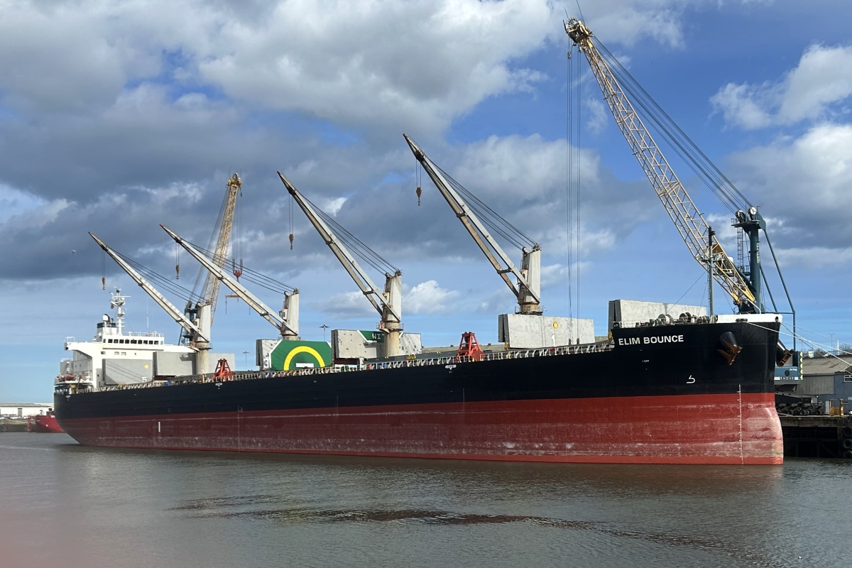 Bulk carrier ELIM BOUNCE unloading steel slabs at Corporation Quay 26/03/2026.