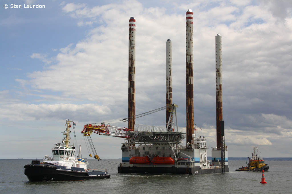 The platform JB 114 leaving Hartlepool for the Tees Bay guided by STEVNS OCEAN at the bow with CRONUS at the stern.