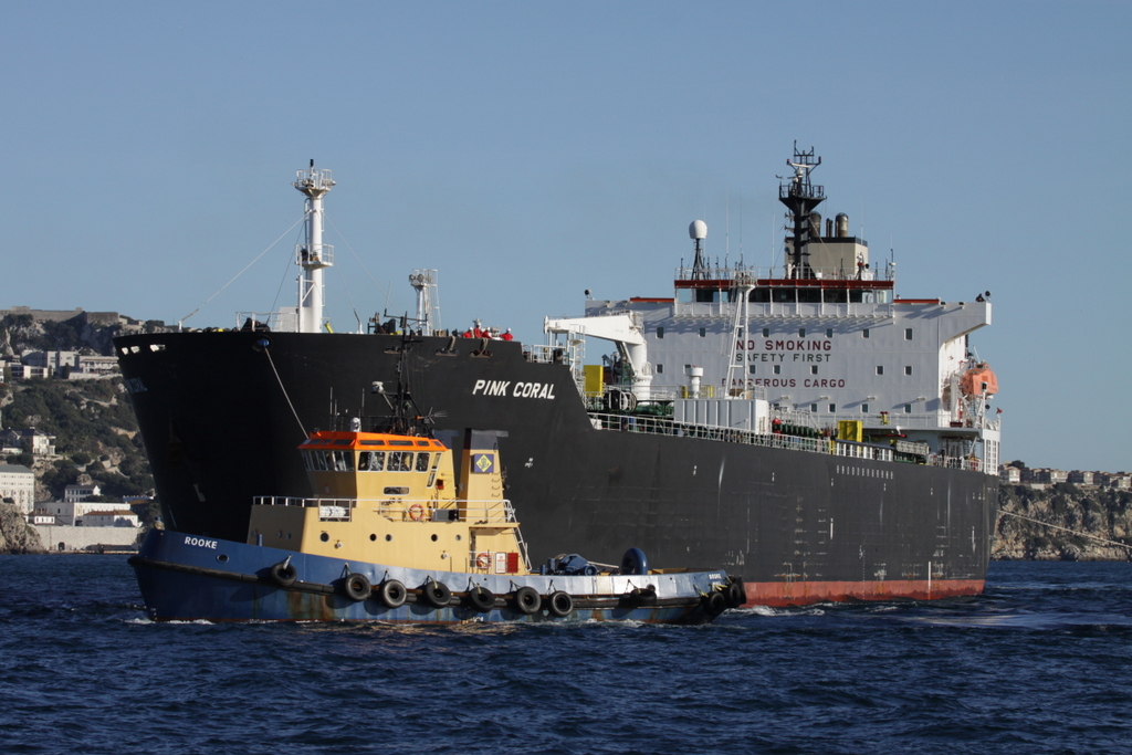 The former SVITZER ELIZABETH, HT SABRE, ADSTEAM ELIZABETH, LADY ELIZABETH assisting the Socomar tanker PINK CORAL off Gibraltar.