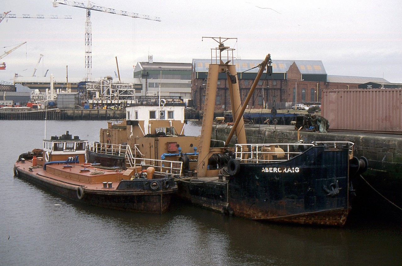 The water boat ABERCRAIG in Tyne Dock on 17/4/1988 when owned by Tyne Water Boats. She was built as MOB 9 (‘Millitary Oil Barge’) in 1945 by the Shipbuilding Corp., Tyne Branch, Walker.