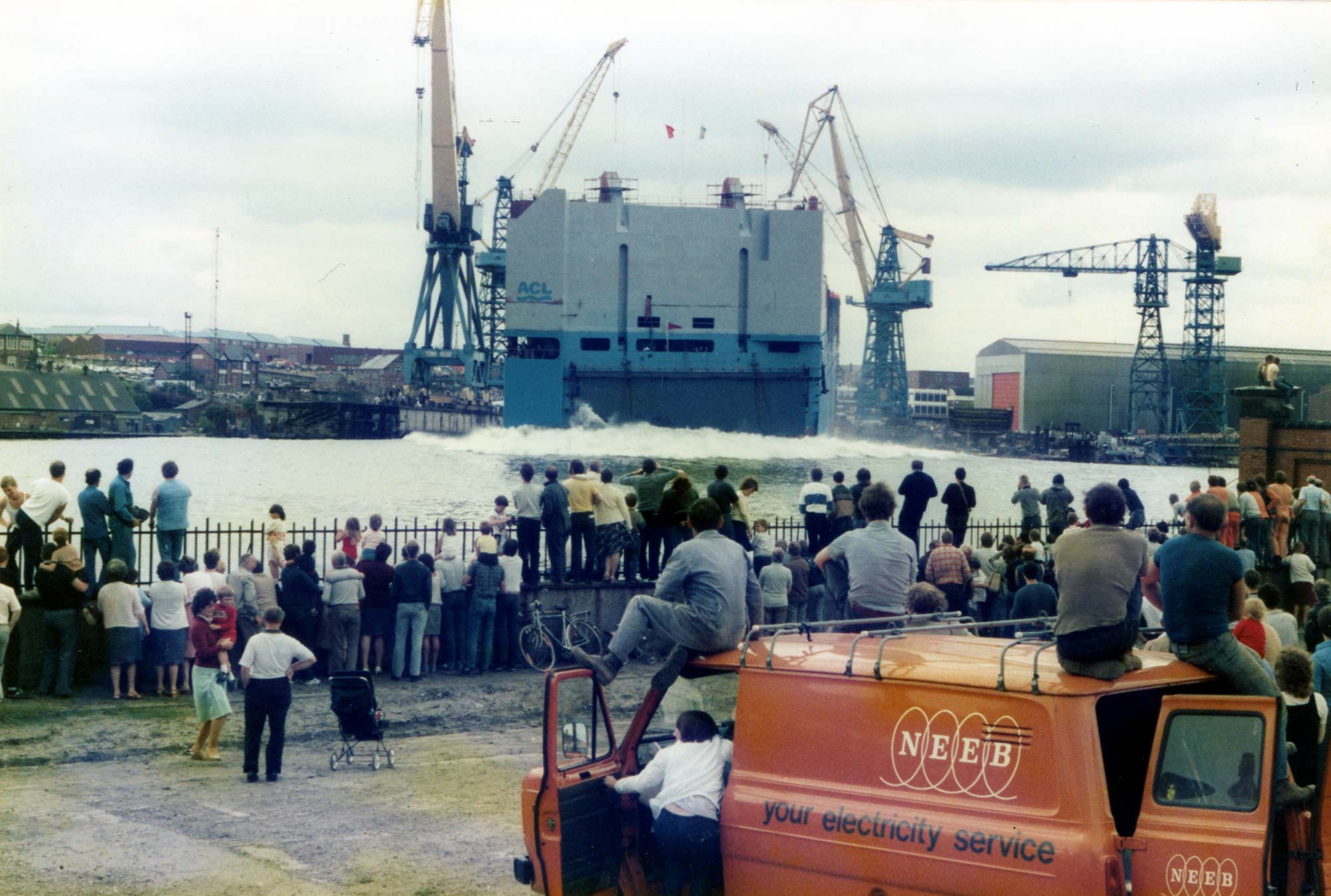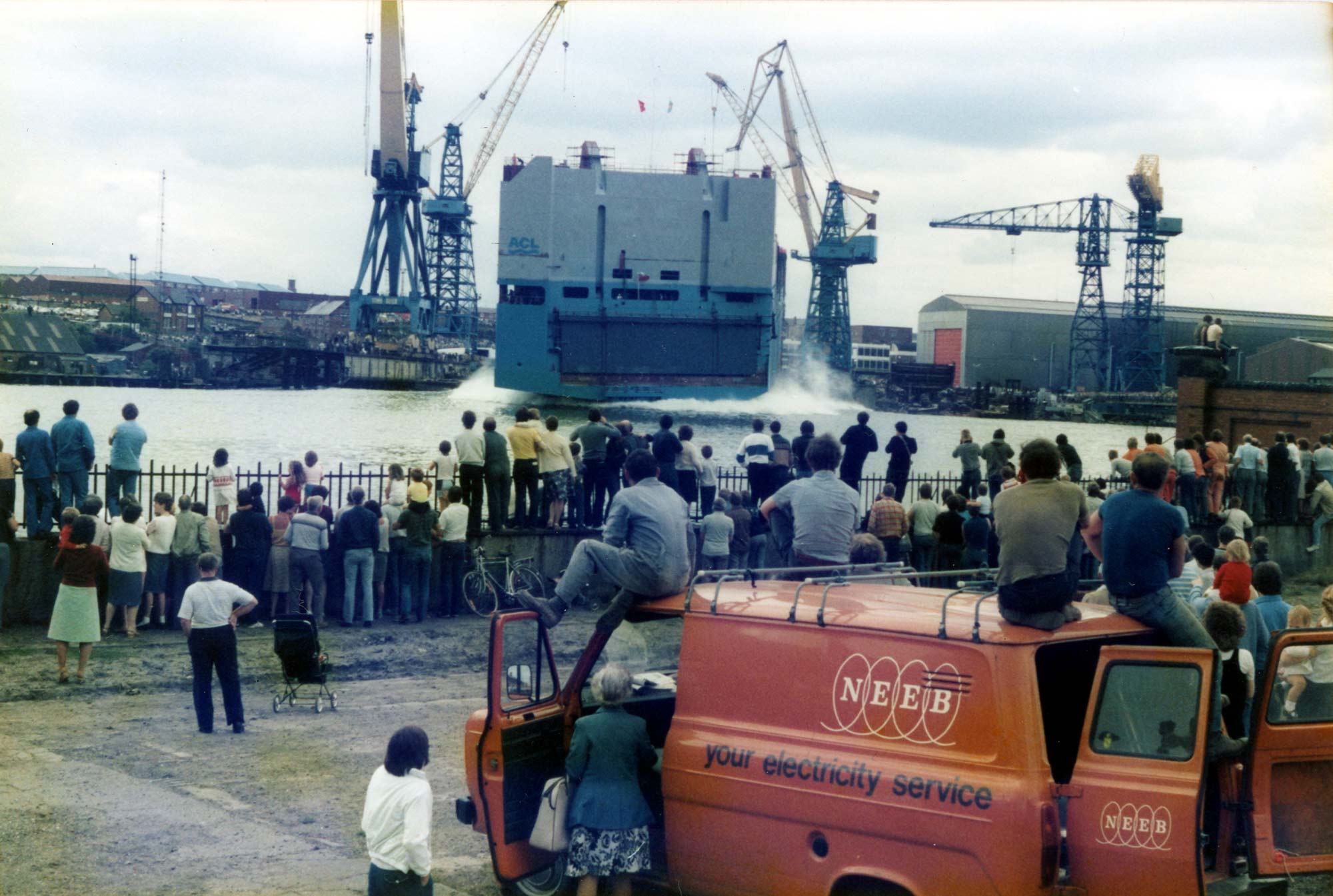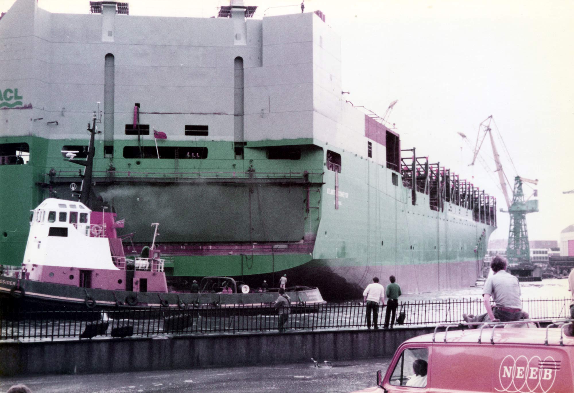 In the aerial view note the structures just inside the gate at Hebburn Dock. The two blocks were the upper blocks of Atlantic Conveyor's superstructure including the wheel house, to the right hand side of the dock. The blocks were erected by a large floating sheerlegs a few weeks after launch.