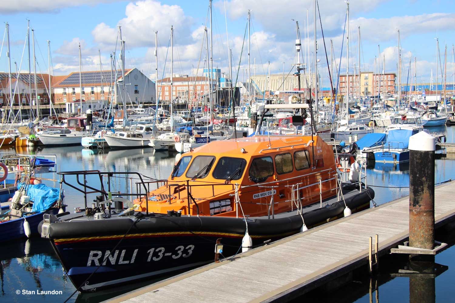 The RNLI Shannon Class lifeboat, BRIDIE O'SHEA (13-33) in Hartlepool Marina. She is part of the relief fleet.