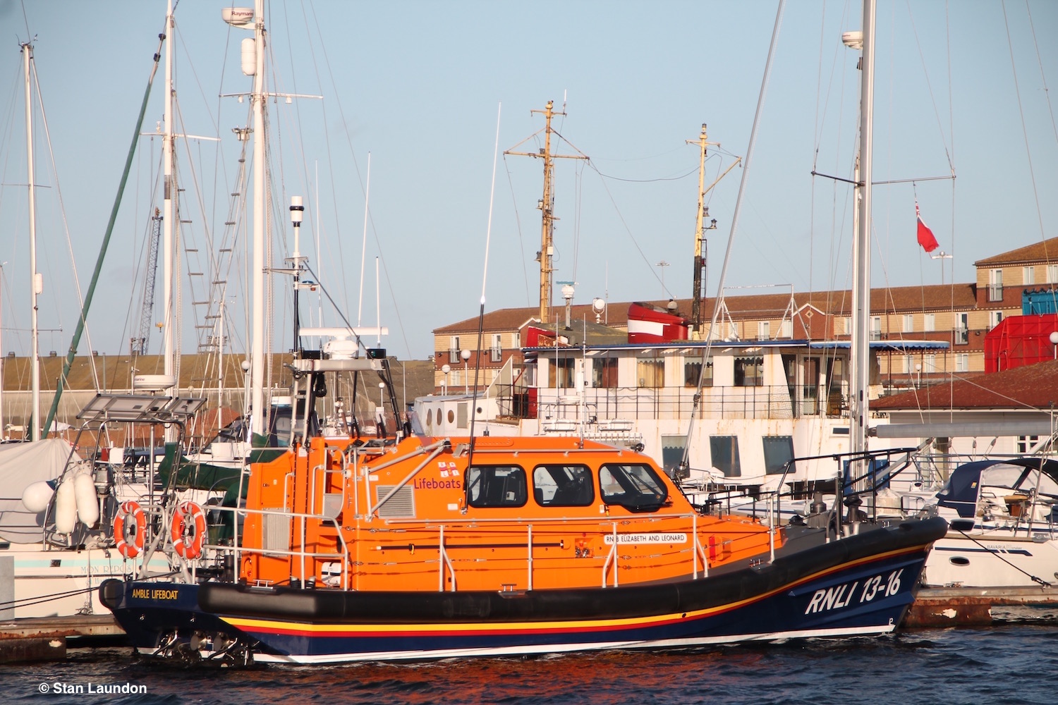 Another view of the RNLI (13-16) "RNLB ELIZABETH AND LEONARD" in Hartlepool Marina. I have since been told that she was transported by road and lifted into the dock here. She is replacing the Mersey class vessel "THE FOUR BOYS" (RNLI 12-19) which has been based at Amble since 1999. Thanks to Derek Hinds for this information.