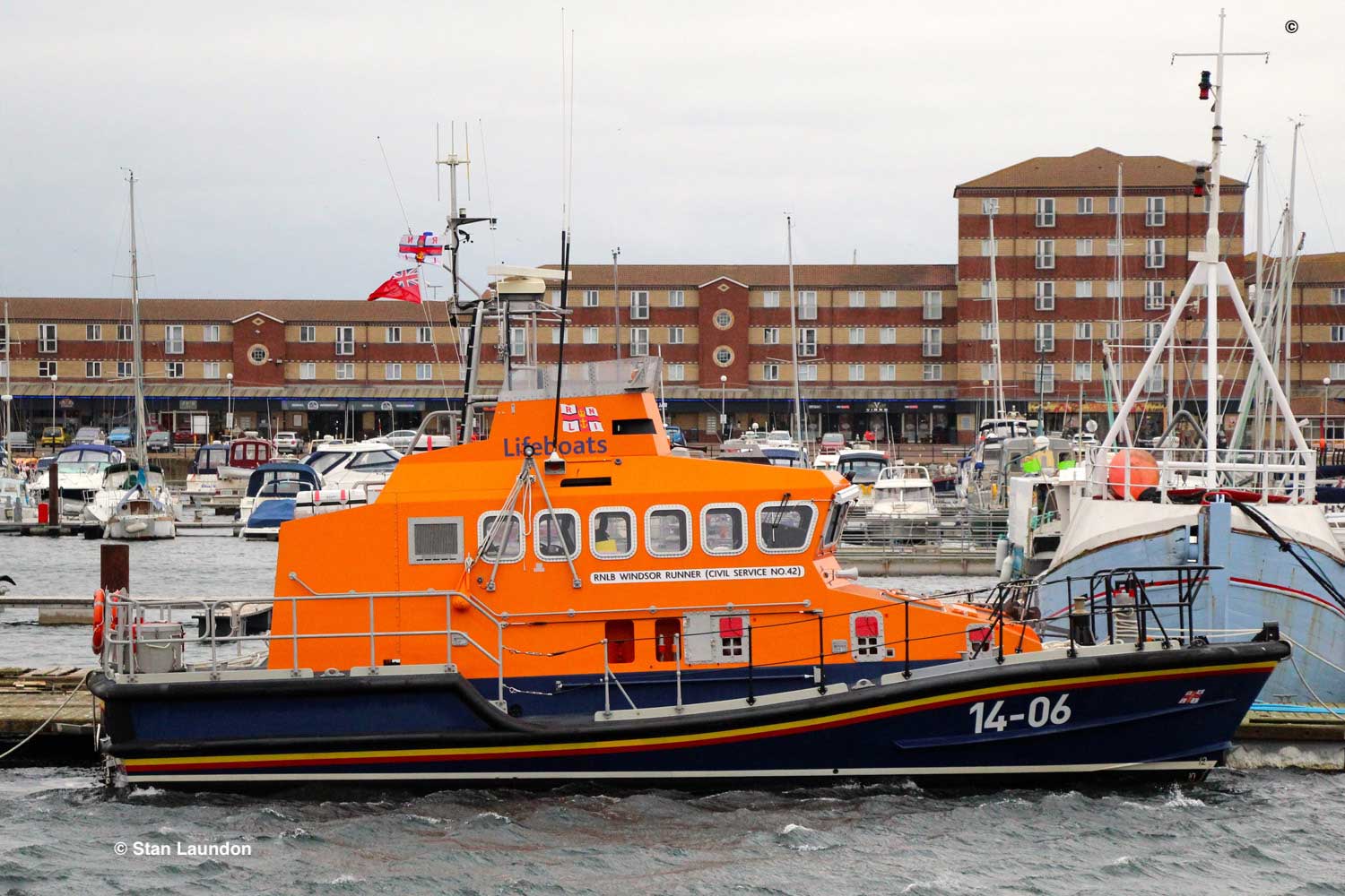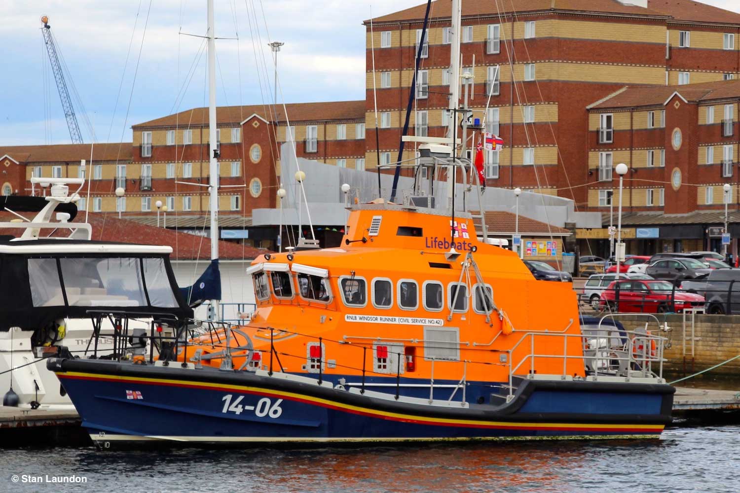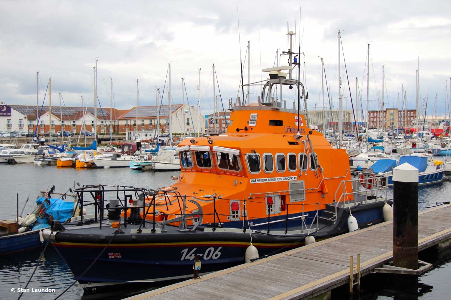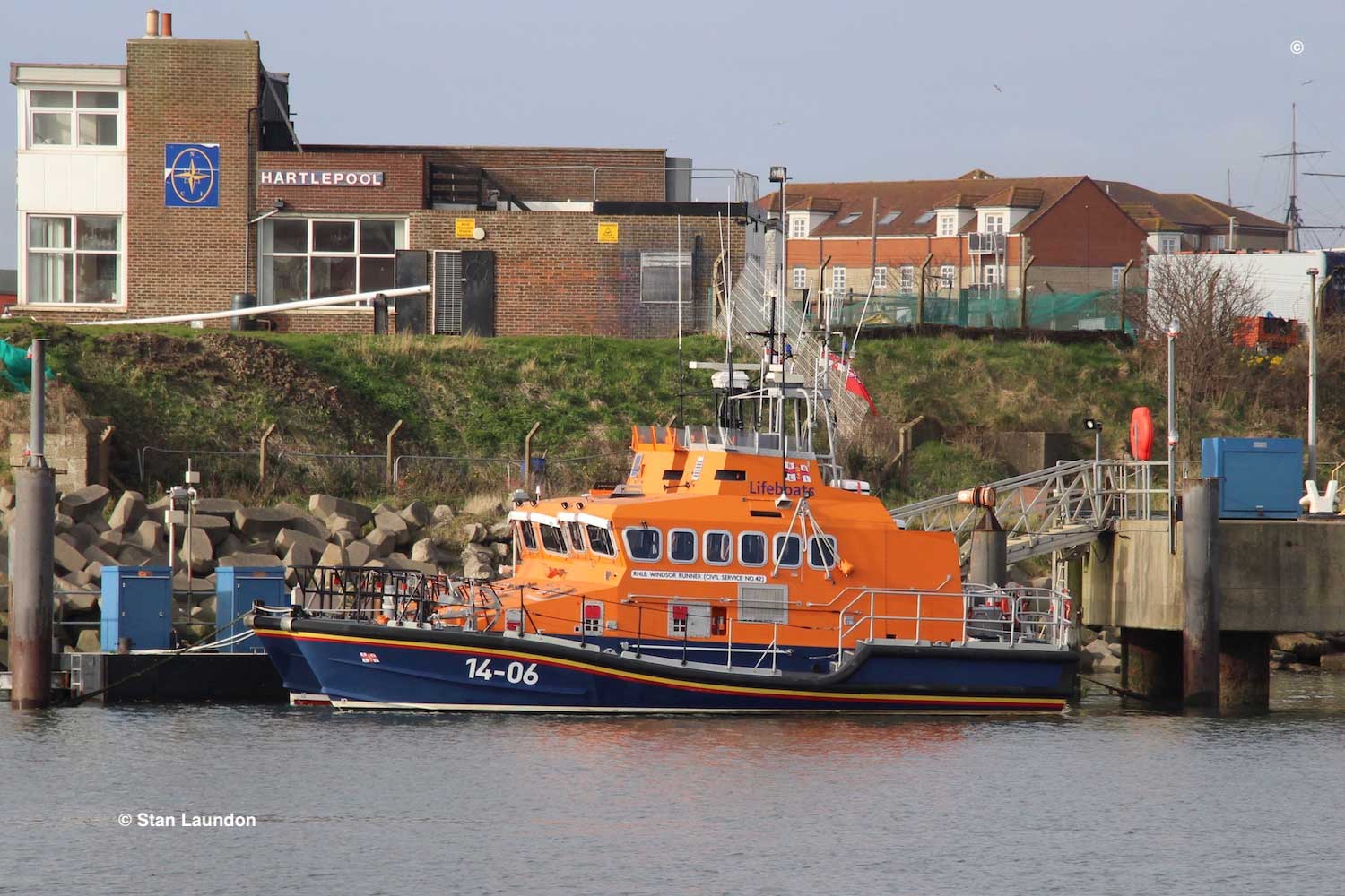 The Trent class lifeboat 14-06 “RNLB WINDSOR RUNNER” (Civil Service No.42) in Hartlepool Marina. She was stationed in Blyth from 1995 to 2004 and became part of the reserve fleet until 2008 when she served, for a short while, at Dunbar (Torness), returning to the reserve fleet as she is now.