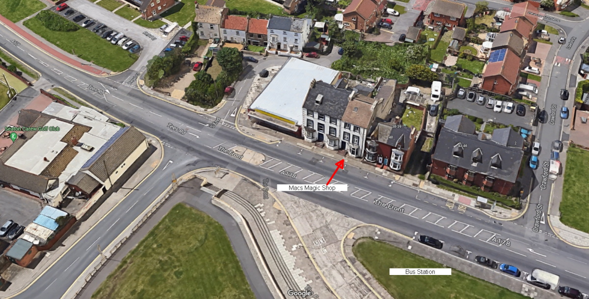 Below is a view from Google Maps and I have marked the Bus Station and Macs Magic Shop as points of reference.