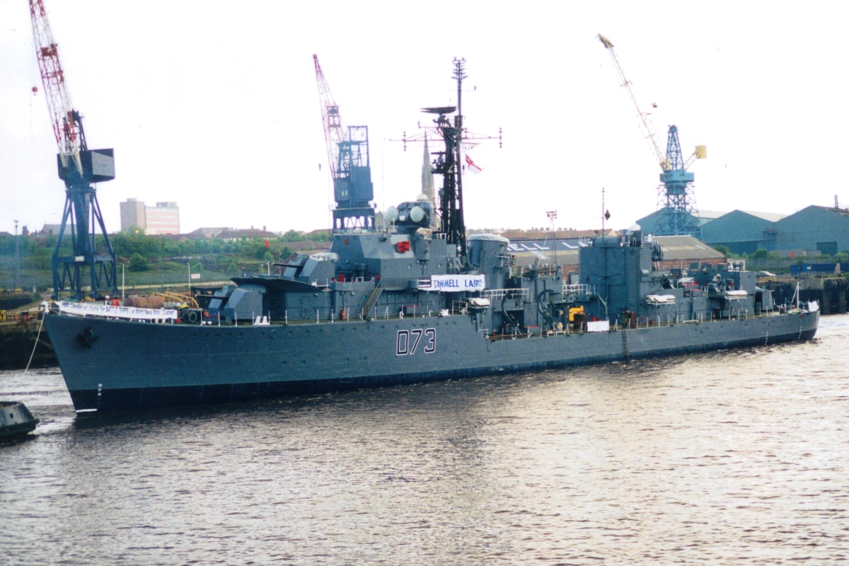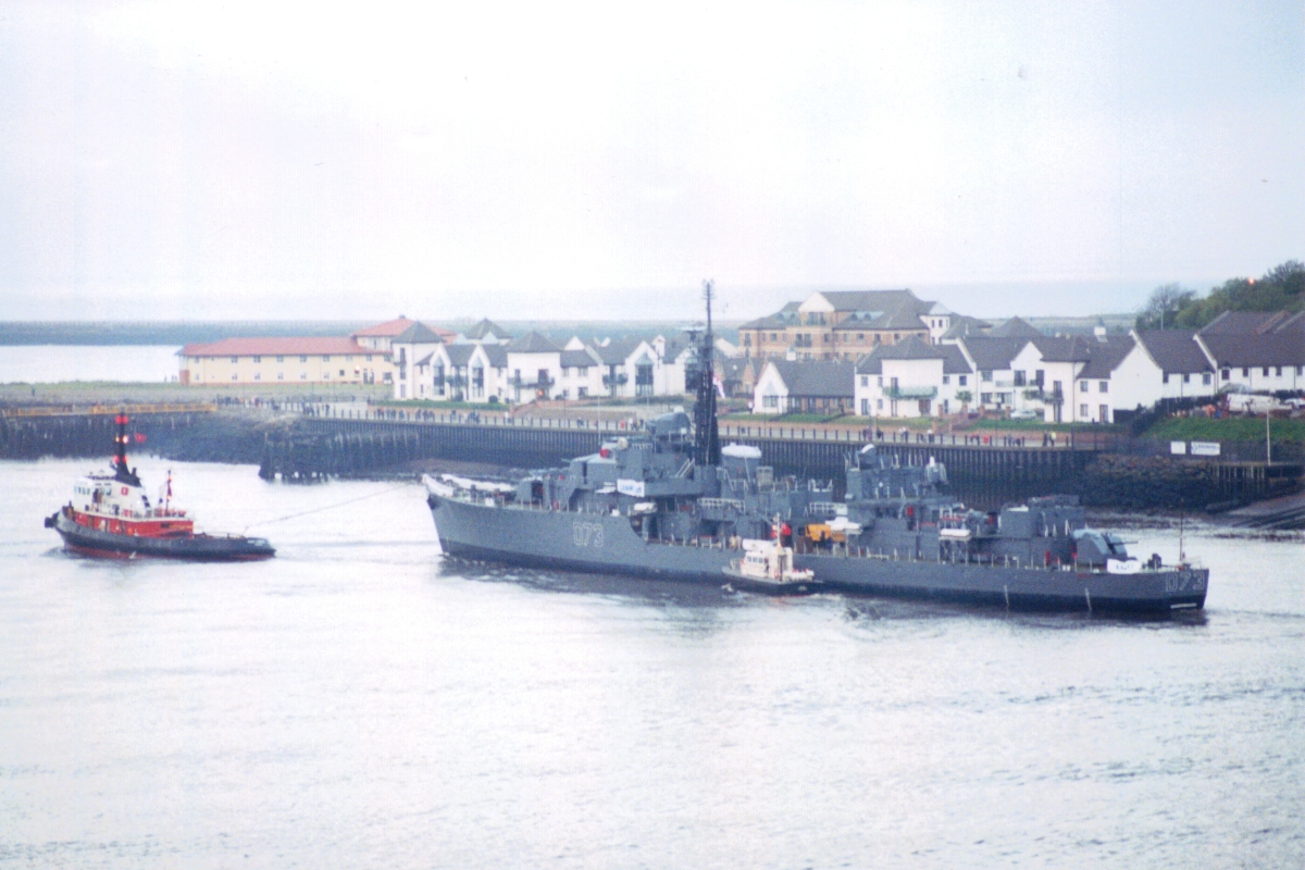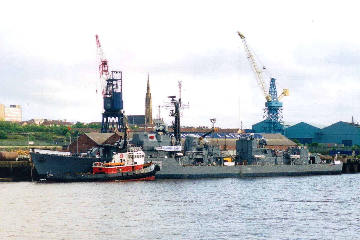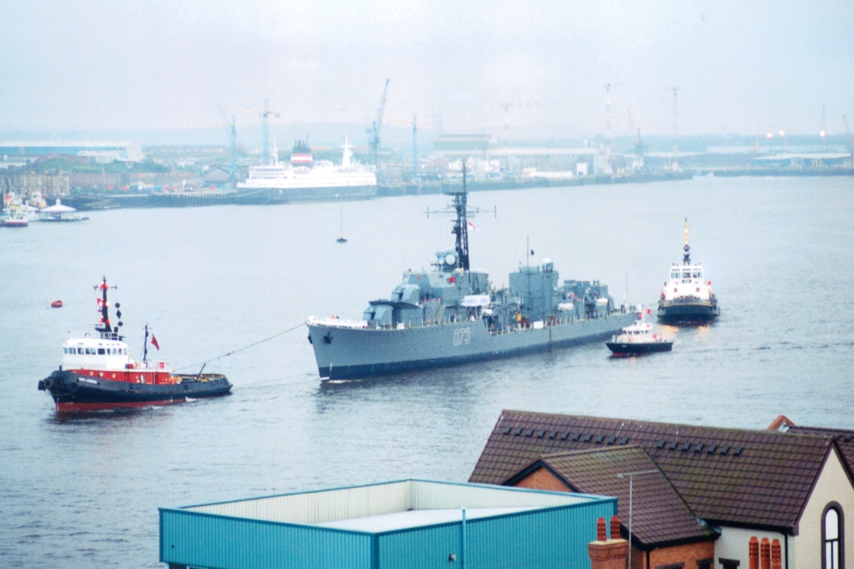 HMS Cavalier R-73 (later D-73) seen entering her once new permanent home at 'I think' the old Hawthorne Leslie yard on Tyneside.