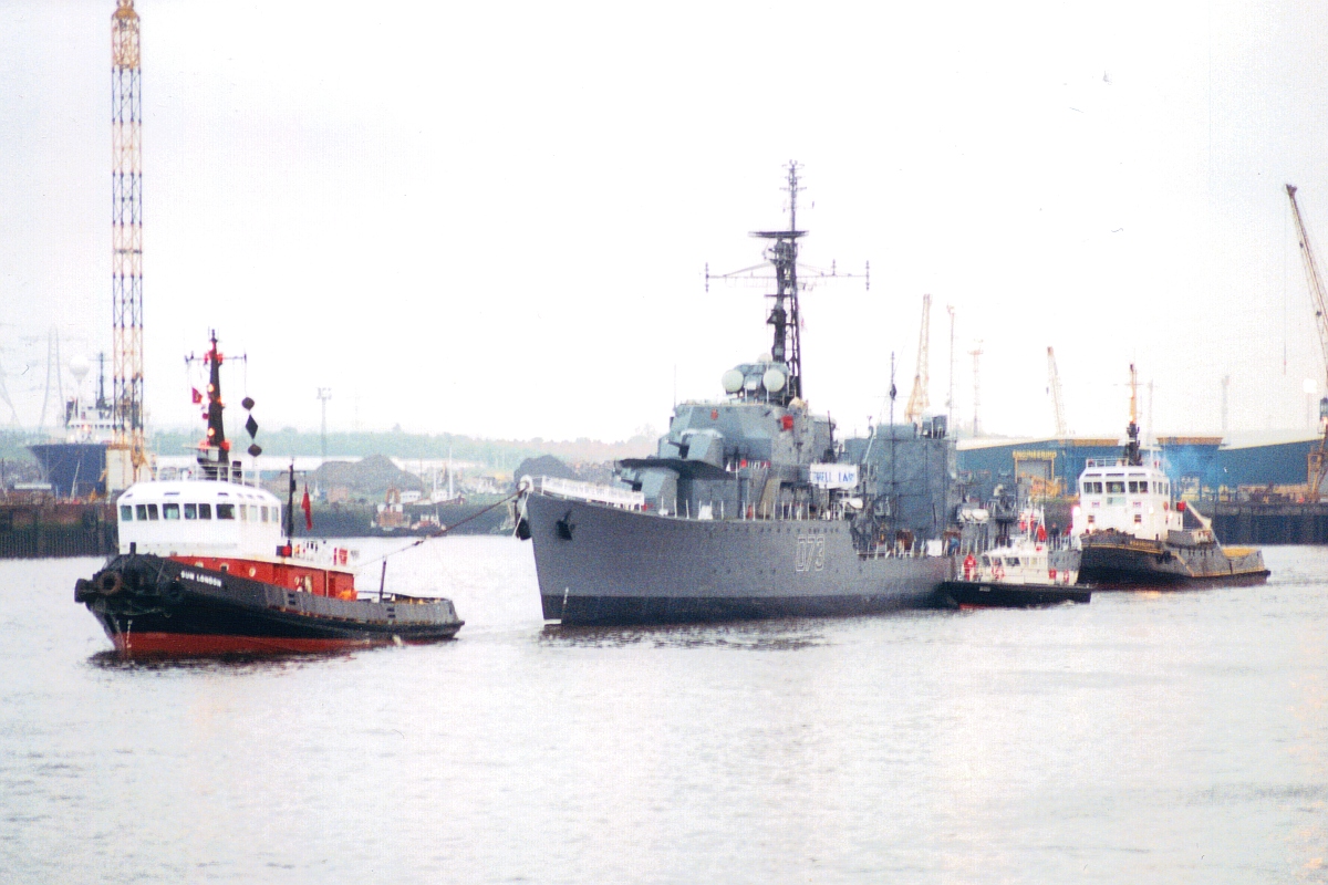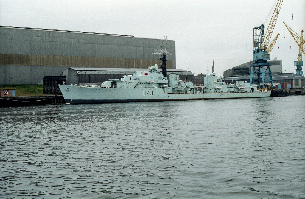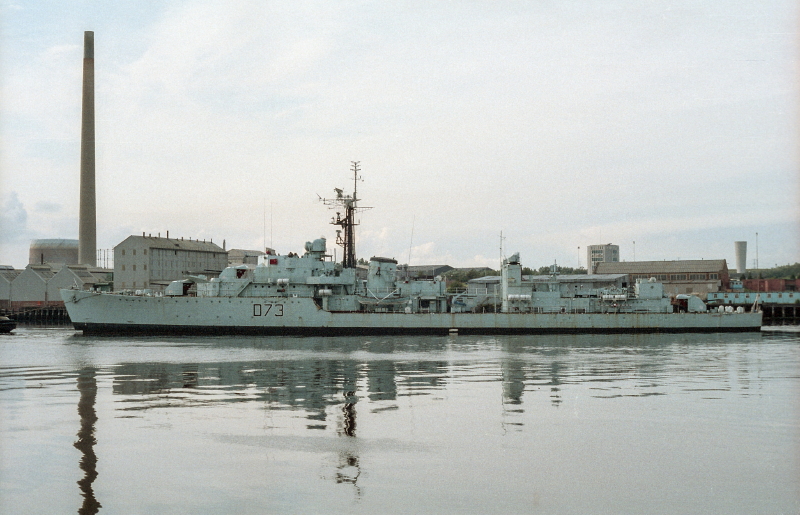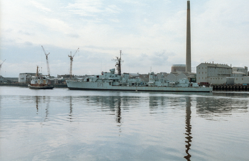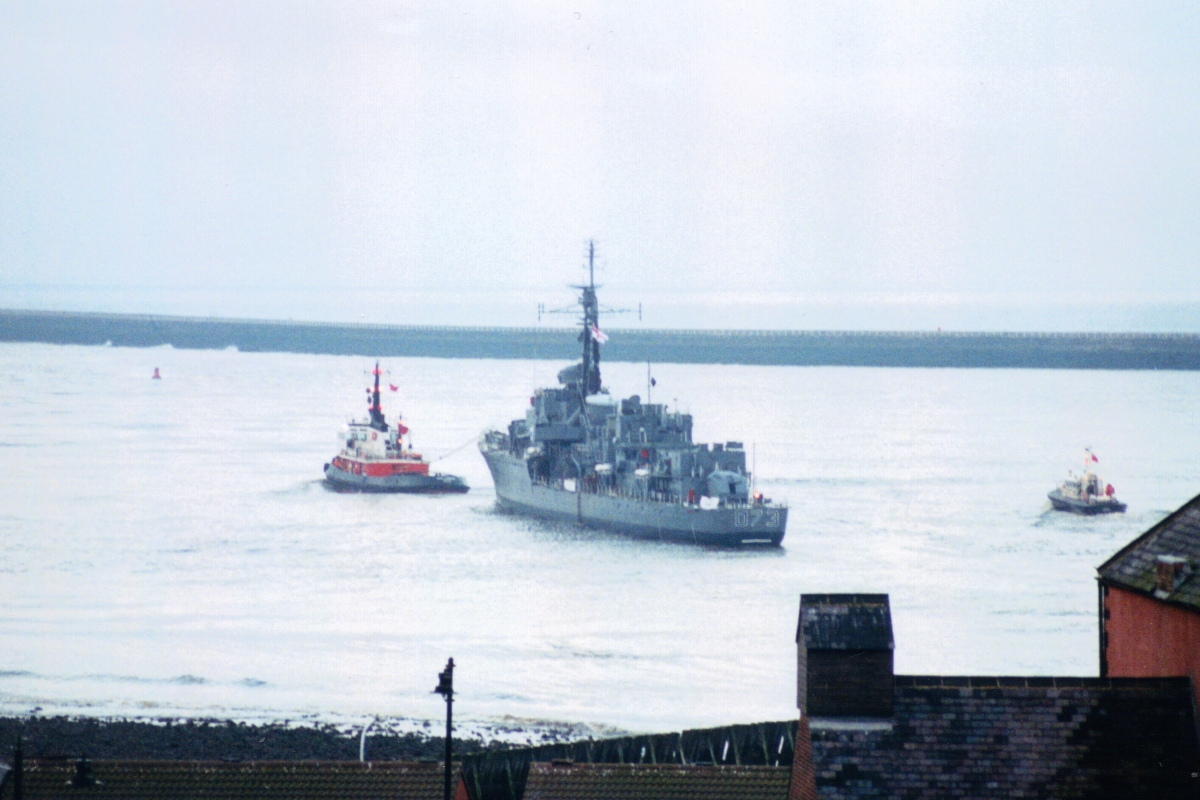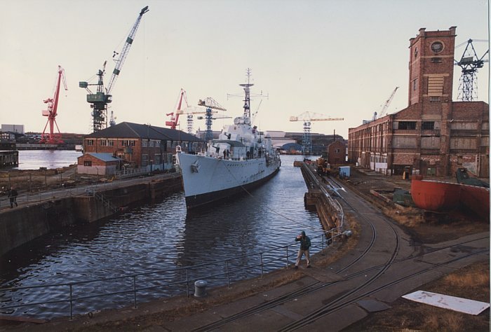 HMS Cavalier R-73 (later D-73) seen entering her once new permanent home at 'I think' the old Hawthorne Leslie yard on Tyneside.
