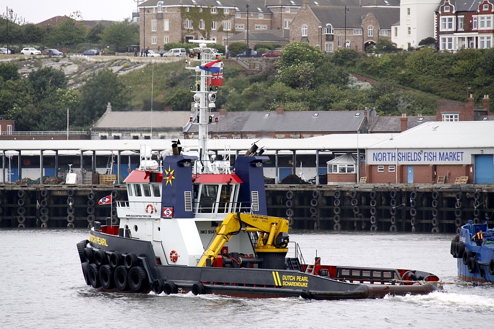 DUTCH PEARL arriving on the Tyne from Cuxhaven on 04/06/2011, towing the back hoe dredger MARICAVOR.