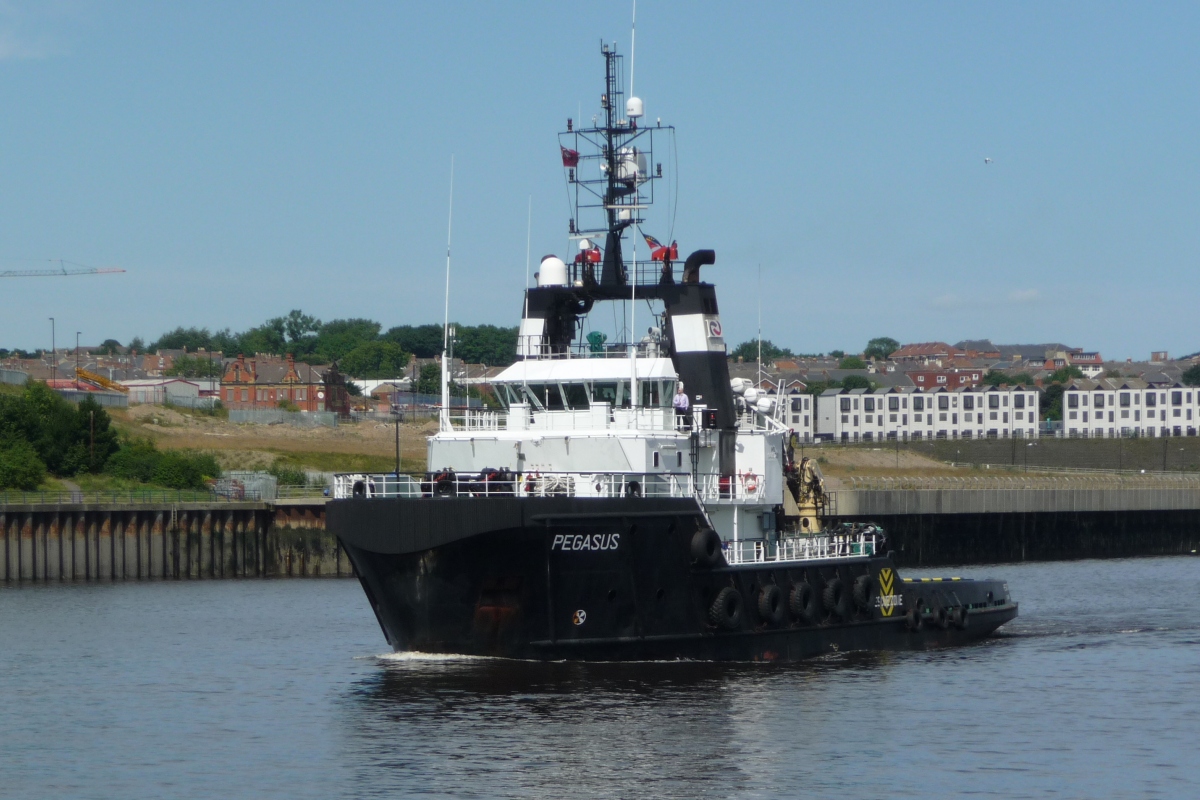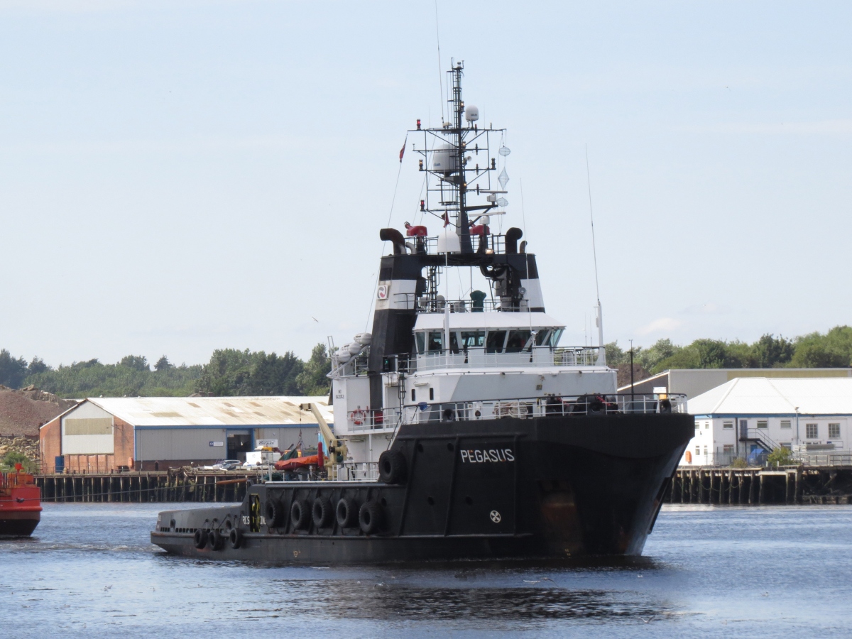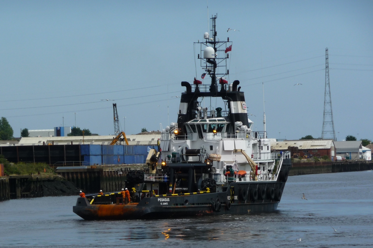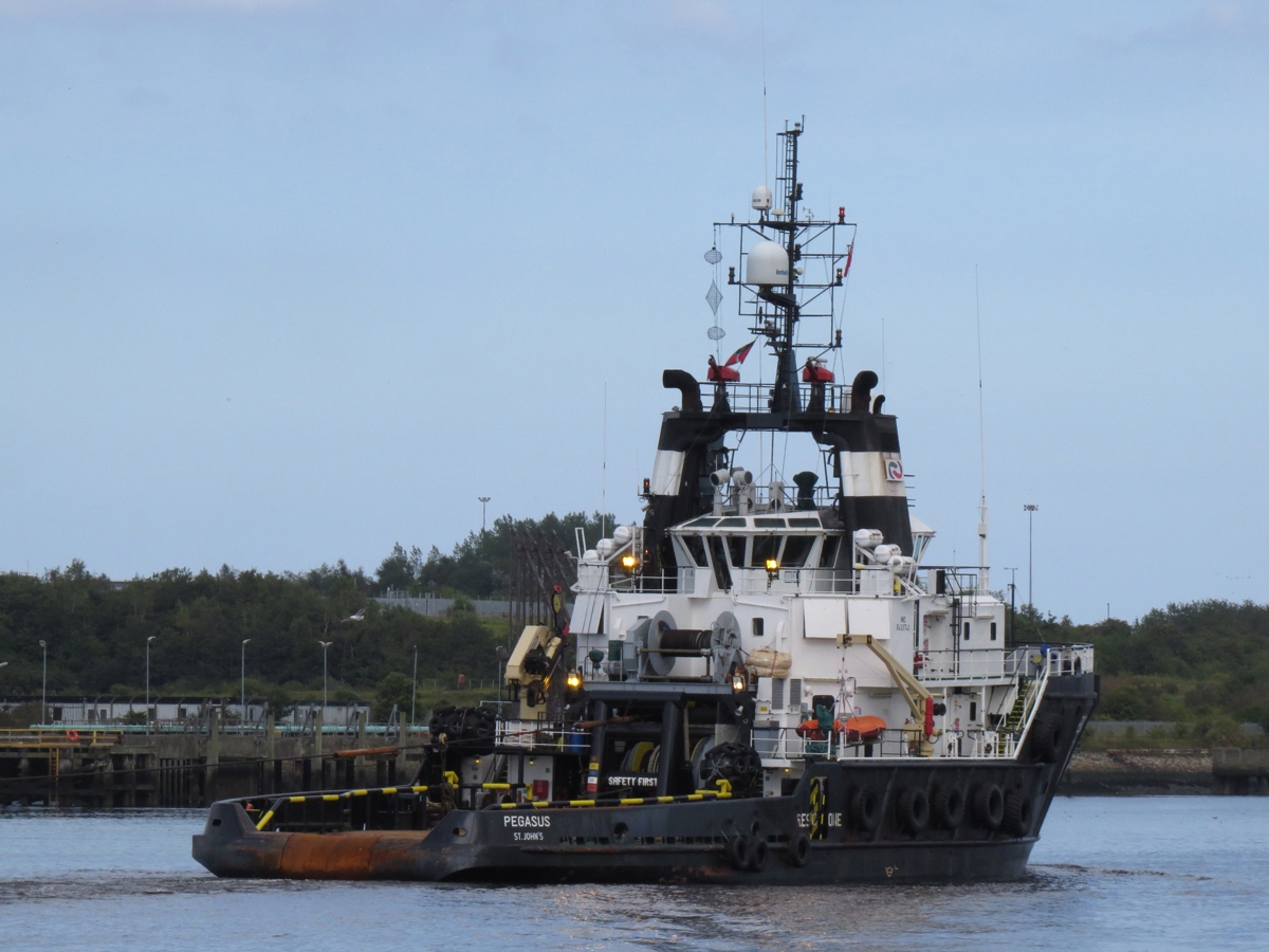 Harms tug PEGASUS inwards to pick up a barge loaded with wind farm bases 10/08/2017.