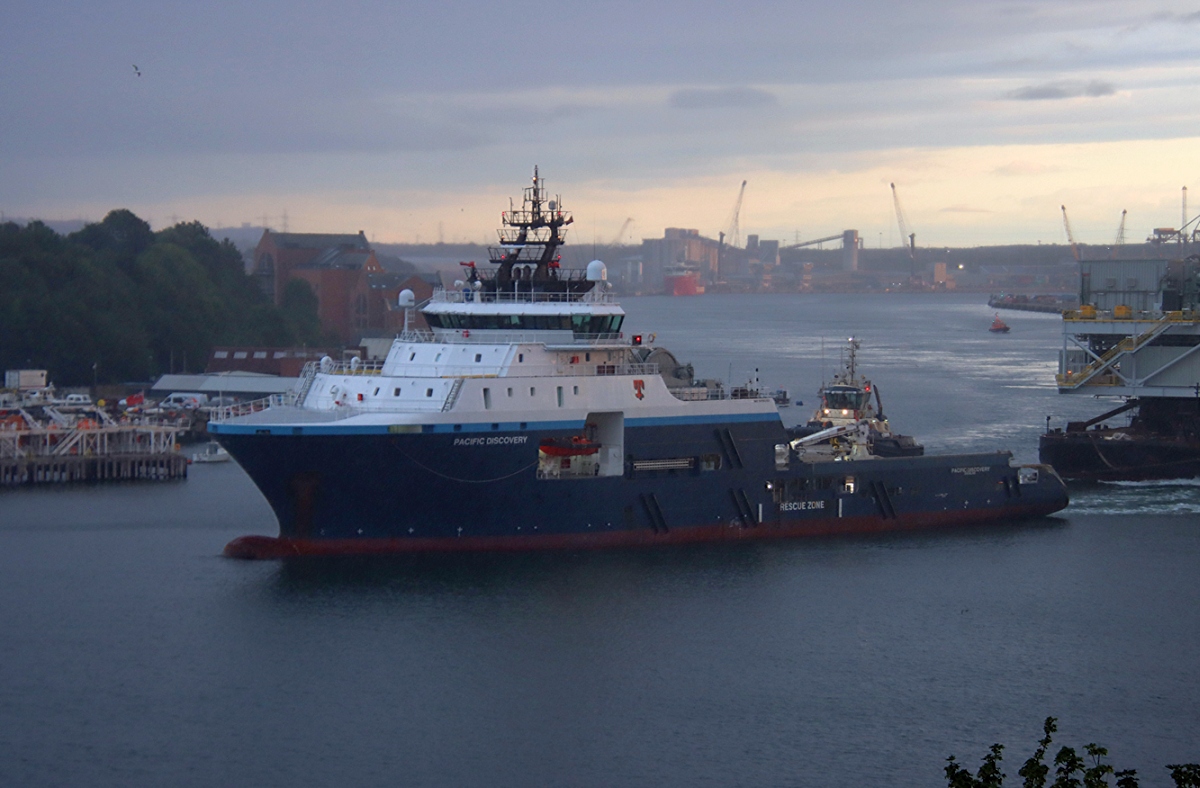 PACIFIC DISCOVERY with a barge inwards to the Tyne 01/07/2025 in challenging light. Photos by Richard Athey.