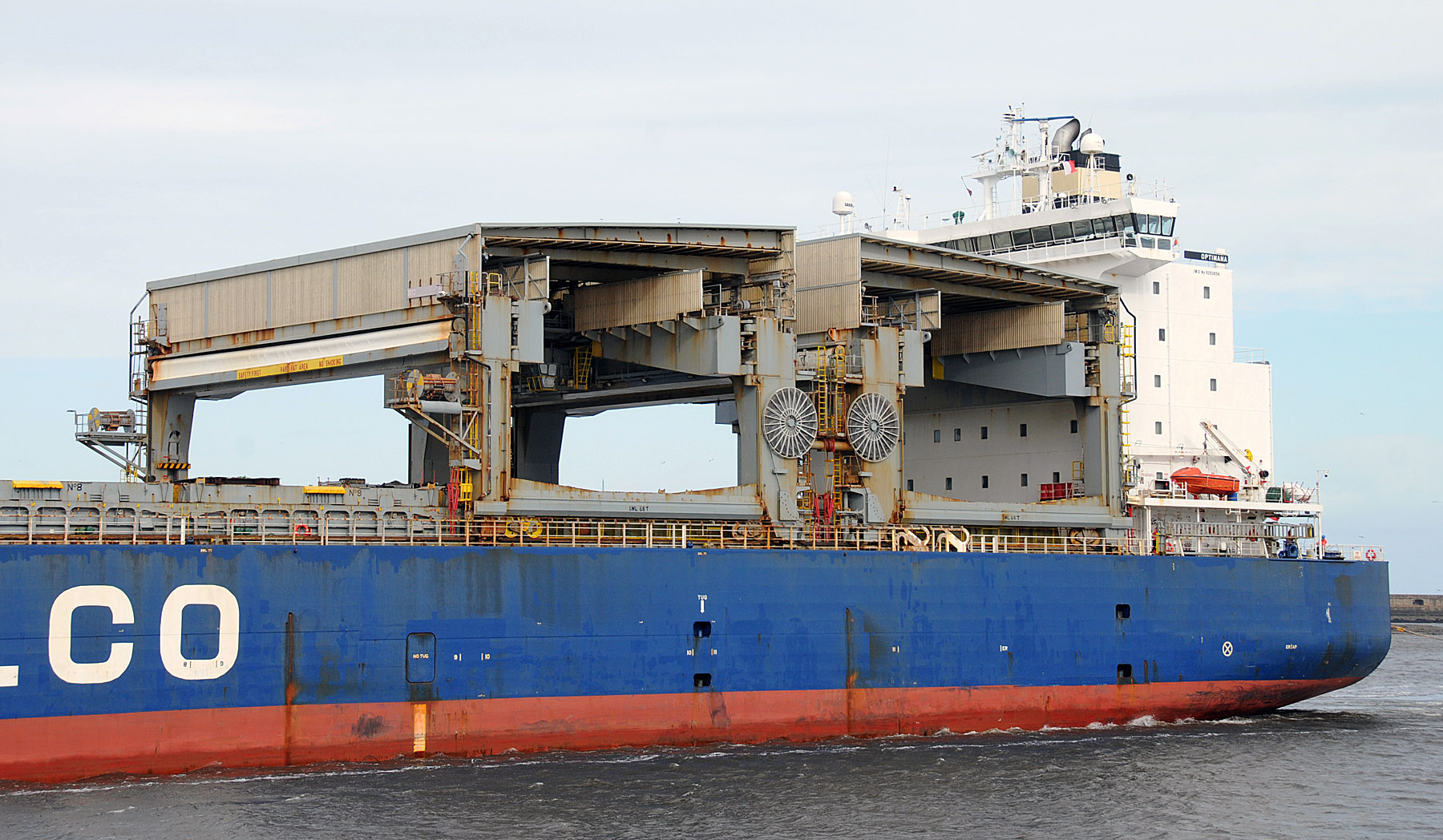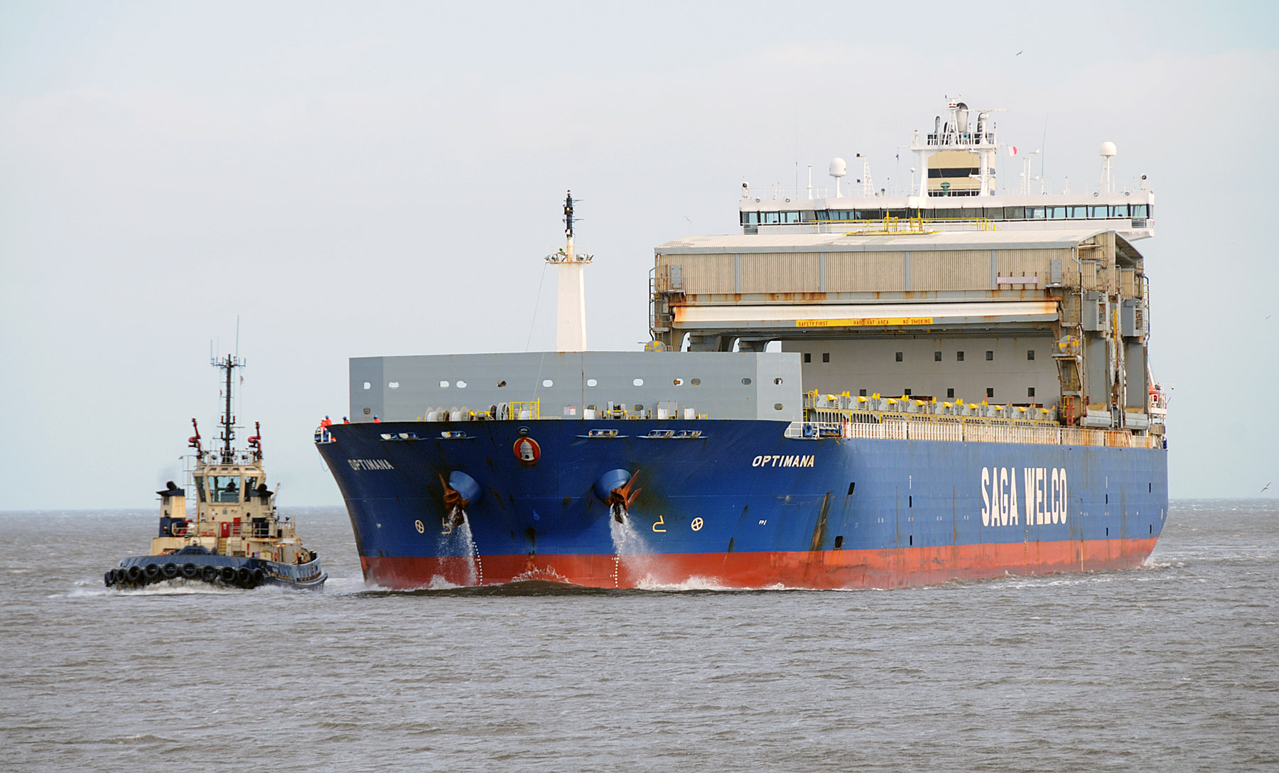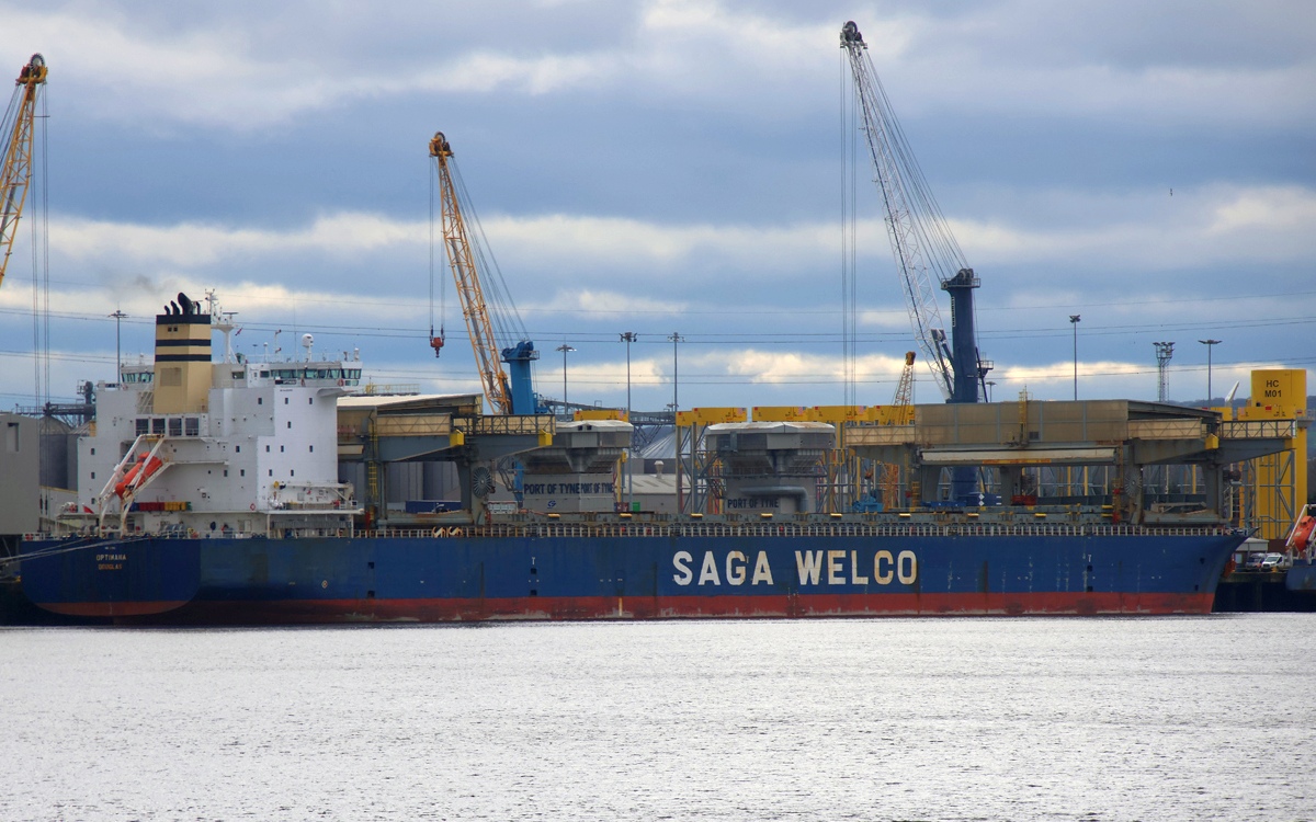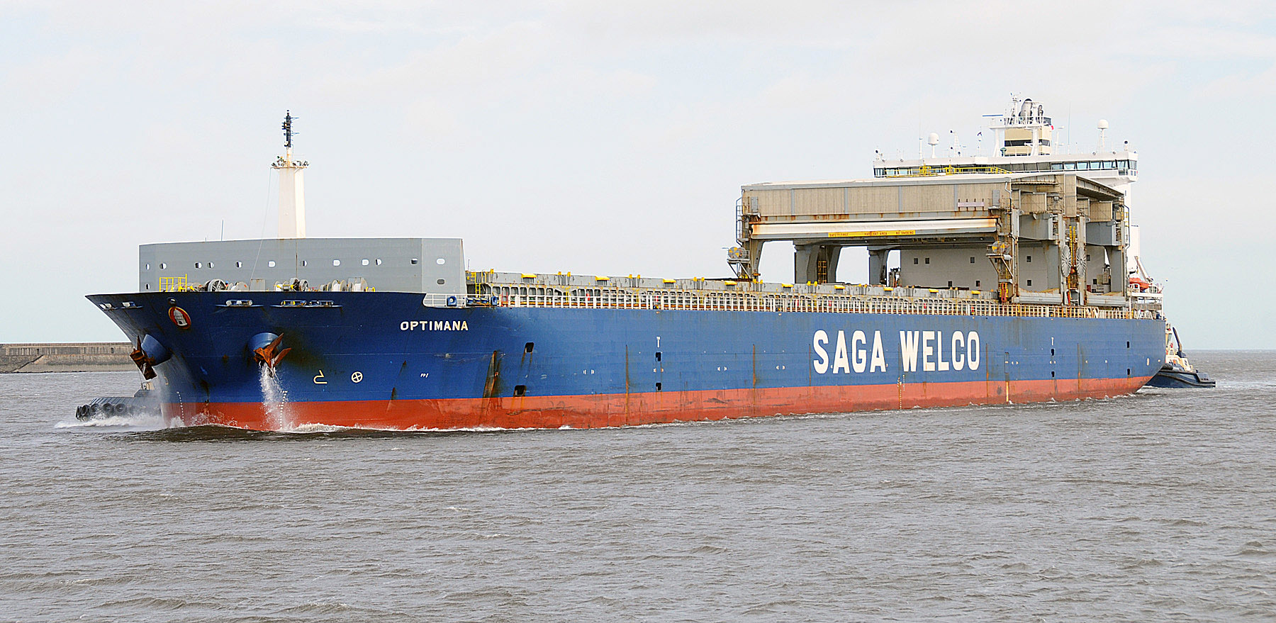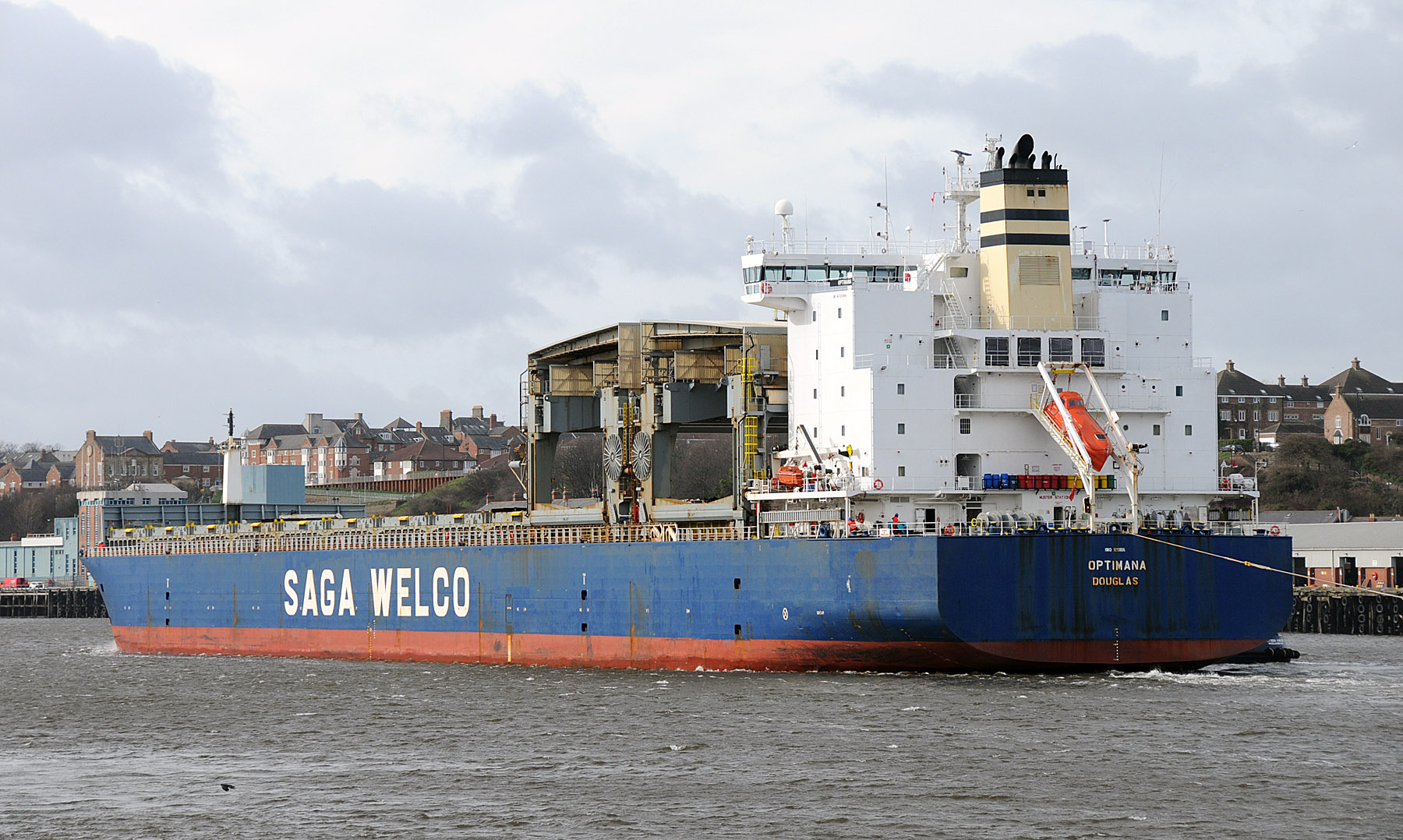 Saga Welco operate a fleet of forty eight open-hatch vessels in nine different classes, all fitted with travelling gantry cranes, OPTIMANA is one of a class of three sisters ships. In a strong wind she arrived from Nigg this morning and was assisted up to the RSQ by three tugs