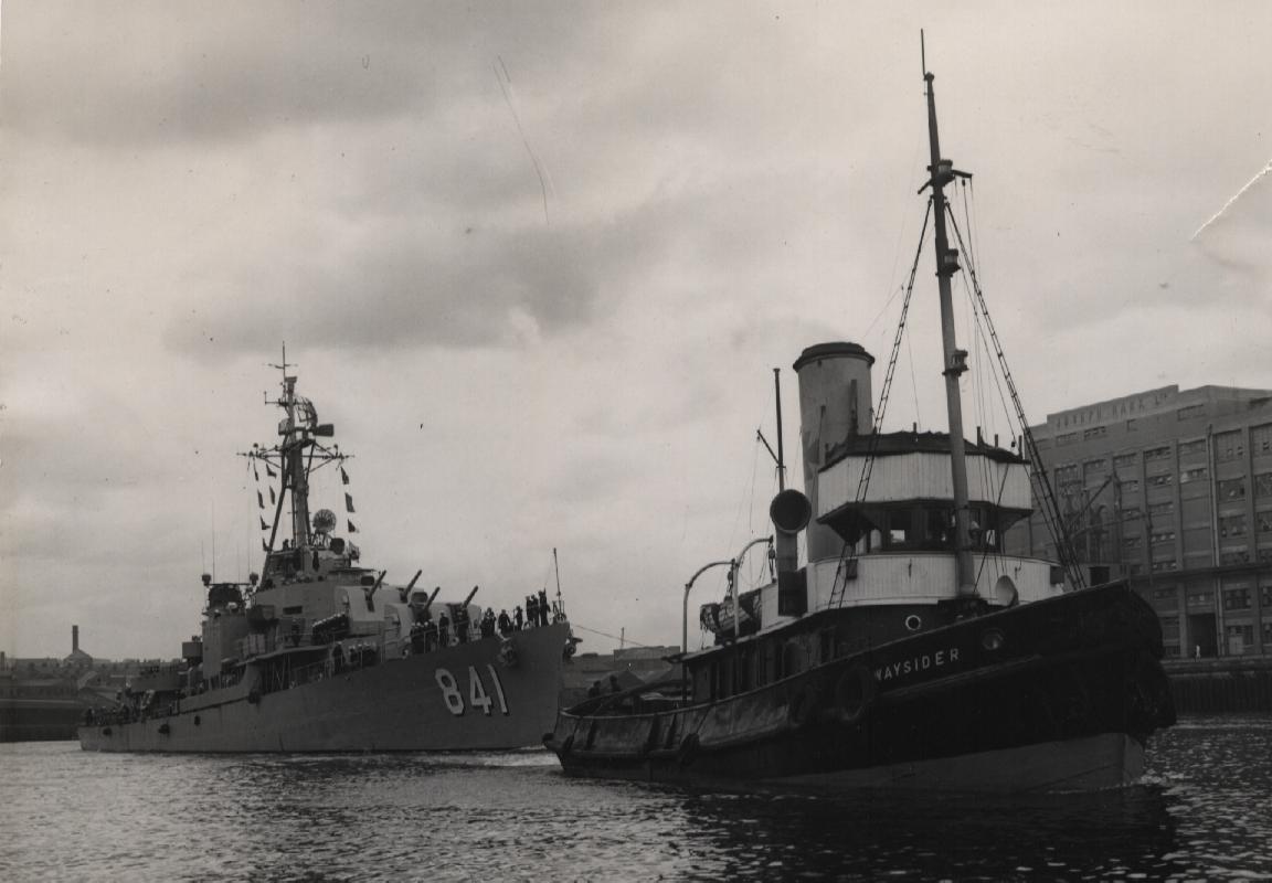 NOA, a Gearing-class destroyer of the United States Navy, being brought up to Newcastle Quay by the WAYSIDER.
