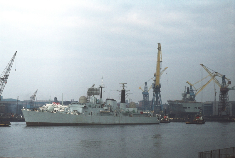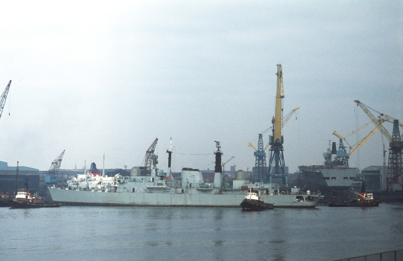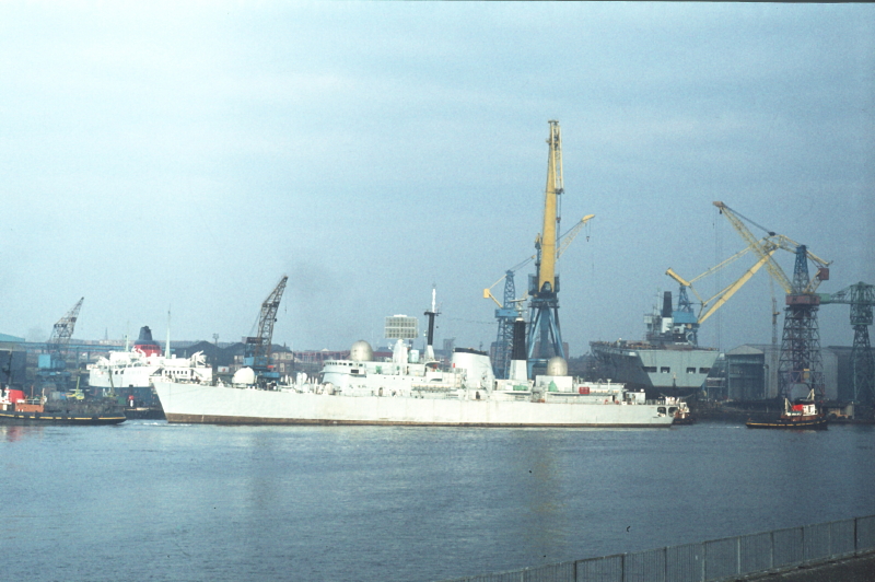 HMS Glasgow, launched on14 April 1976, seen here outfitting at Wallsend on 4 June 1976. Just over three months later, on 23 September 1976, a flash-fire, caused by oxygen leaking overnight from an incompletely isolated burning torch, cost the lives of eight shipyard workers as they started their day's work. In a completely unrelated incident a ninth worker slipped and fell into the river overnight and drowned. The blackest day on the river in my lifetime.