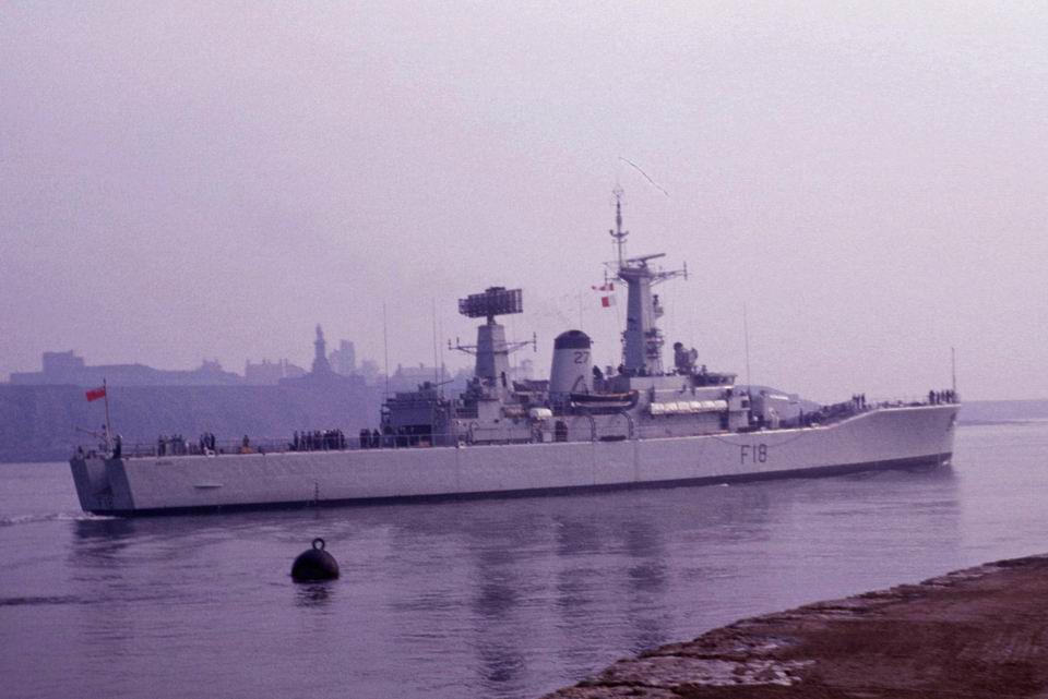 Those 26 Leanders are twice the number of frigates we currently have all being Type 23's. When Galatea commissioned in April 1964 we had over 50 frigates. Her photo in immediate preceding post under the red duster conducting trials shows how all the early ships were completed with the 2 x 40mm bofors above the hangar. She also has the well cut into the transom but did not have the VDS (Variable Depth Sonar) intended to utilise it.