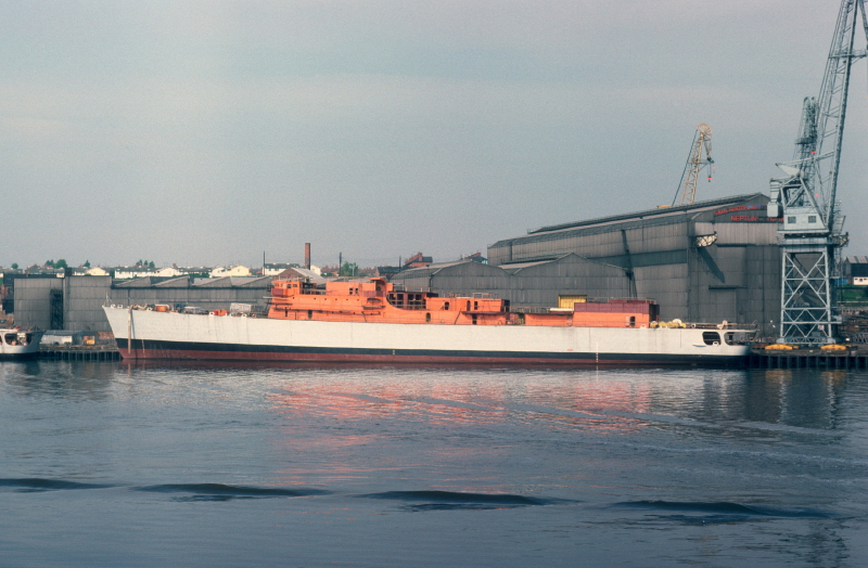 HMS Glasgow, launched on14 April 1976, seen here outfitting at Wallsend on 4 June 1976. Just over three months later, on 23 September 1976, a flash-fire, caused by oxygen leaking overnight from an incompletely isolated burning torch, cost the lives of eight shipyard workers as they started their day's work. In a completely unrelated incident a ninth worker slipped and fell into the river overnight and drowned. The blackest day on the river in my lifetime.