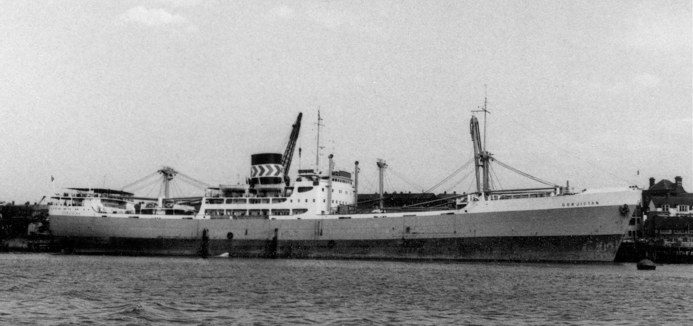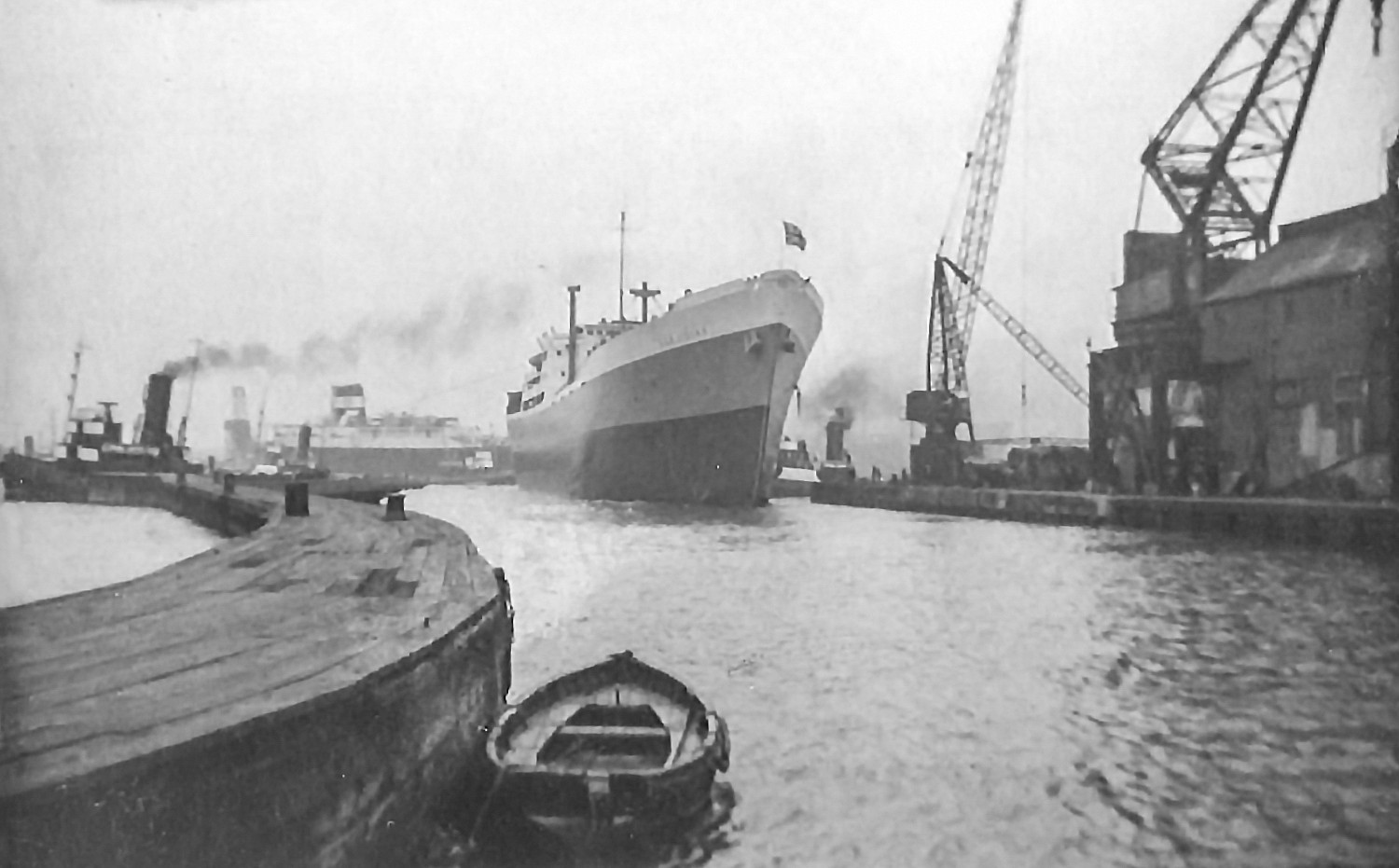 59 Years ago today! Not a particularly clear photograph (one of my first efforts with a Brownie 127) showing Gorjistan being manoeuvred into Readhead’s Gut after her launch on 1 May 1961, but the old timber jetty to the left is interesting. The 1894 OS map of the area shows, extending from the far end of the jetty, roughly where the stern of the nearest tug is, the “Tyne Dock Landing Stage” – presumably one of the many such landings between South Shields and Newcastle used by the Tyne General Ferry company before it was seen off by growing tram services. Everything in the picture has now, of course, vanished.