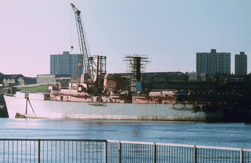 Exeter at Wallasend on 28 June 1980 - a few weeks before handover. Note the non-standard blue boot topping - the RN's first trial application of self-polishing copolymer (SPC) anti-fouling (slippery paint) - blue was the only acceptable colour available.