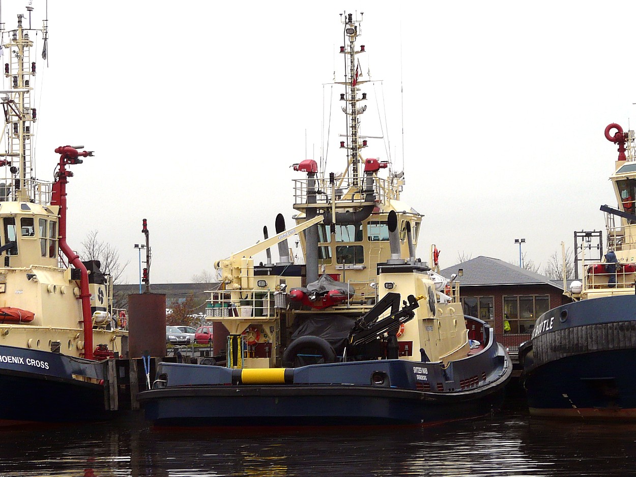 The recently acquired SVITZER NABI, under Danish flag, at the Tees Tug Base on 7 November 2011, taken during a trip on board the COB (q.v.) on that day celebrating her own 100th birthday.