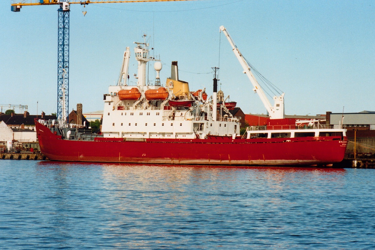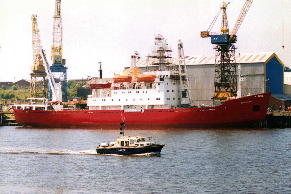 BRANSFIELD alongside at Wallsend and with the old Port of Tyne survey vessel in the foreground.