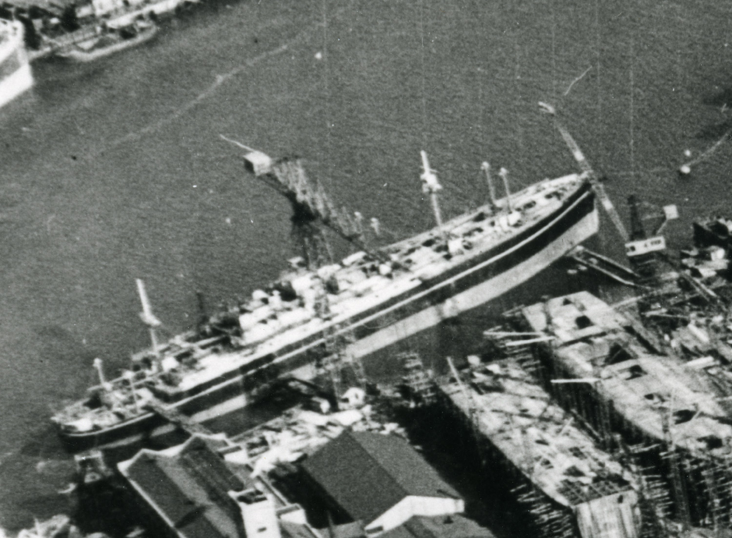 Sean, a very helpful observation which proves we did not look closely enough at this trio of vessels .... the two inside seem to be part-completed cargo vessels, there is a flat section in the centre one (just below the forward funnel of the white ship) which may be the base for her bridge structure. The inner one looks rather 'worn' so may be a repair job.