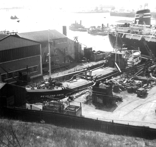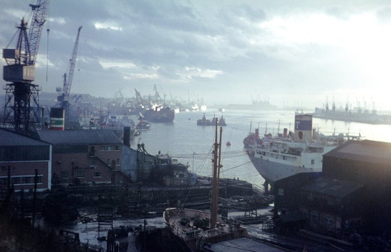 Brigham & Cowan’s “new” 715 feet long dock, dating, from the early fifties, was a favourite of photographers, being readily observable from the adjacent roadway. Also readily visible from a nearby footpath was their older 455 foot dock lying almost parallel to the river. However, until the early sixties, they also operated a smaller, 204 foot, dock between the two larger docks. It is just visible, unoccupied, ahead of the docked collier, in this picture from February 1966. Also just visible alongside the small dock is a storage area that was once a fourth dock, filled-in during the fifties to create storage space and, I believe, a sullage tank