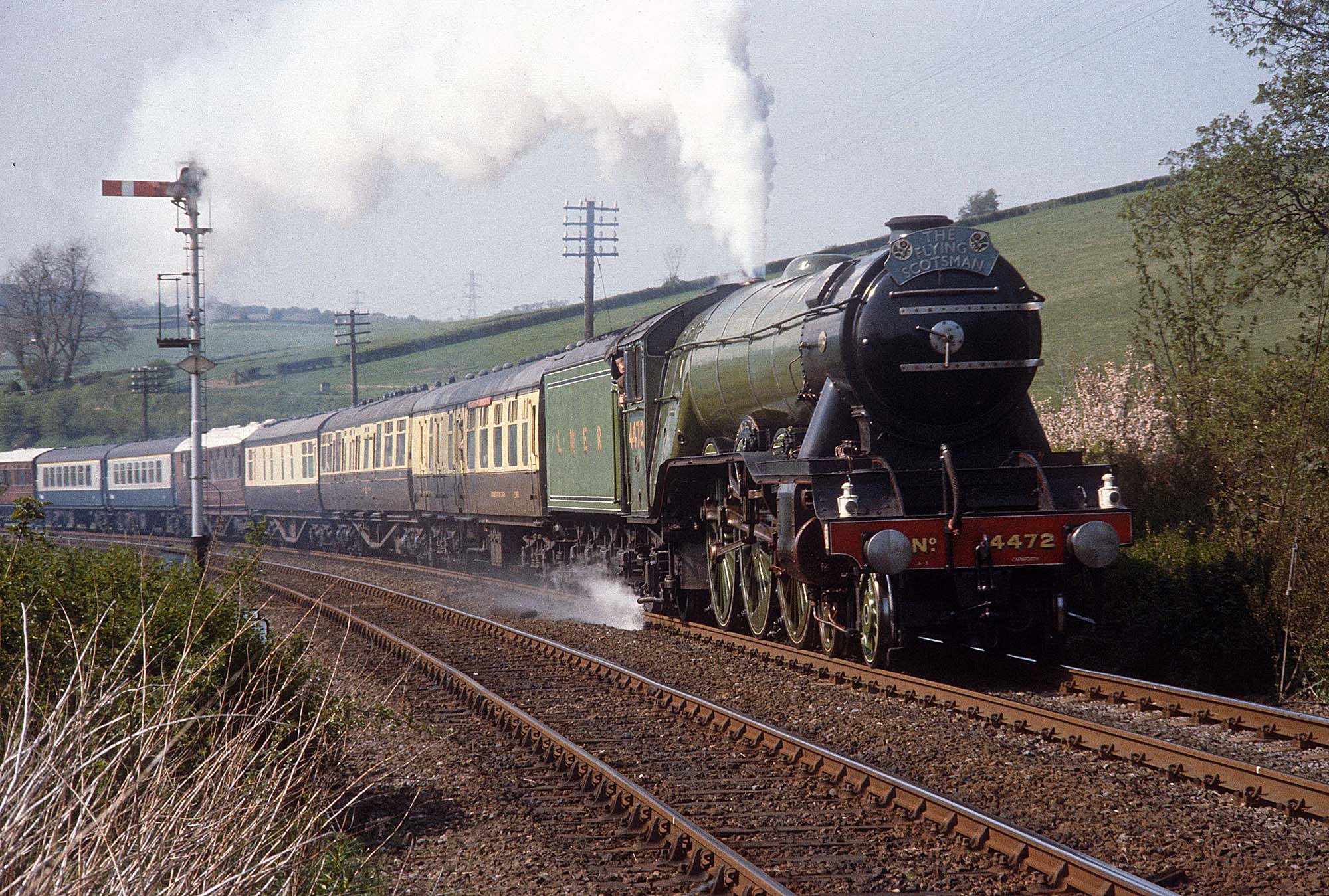 With steam to spare FLYING SCOTSMAN heads eastwards between Fourstones and Hexham, on the Tyne Valley railway line. The date would be prior to 1983, the year that the GWR coaches immediately behind the loco were banned from mainline running