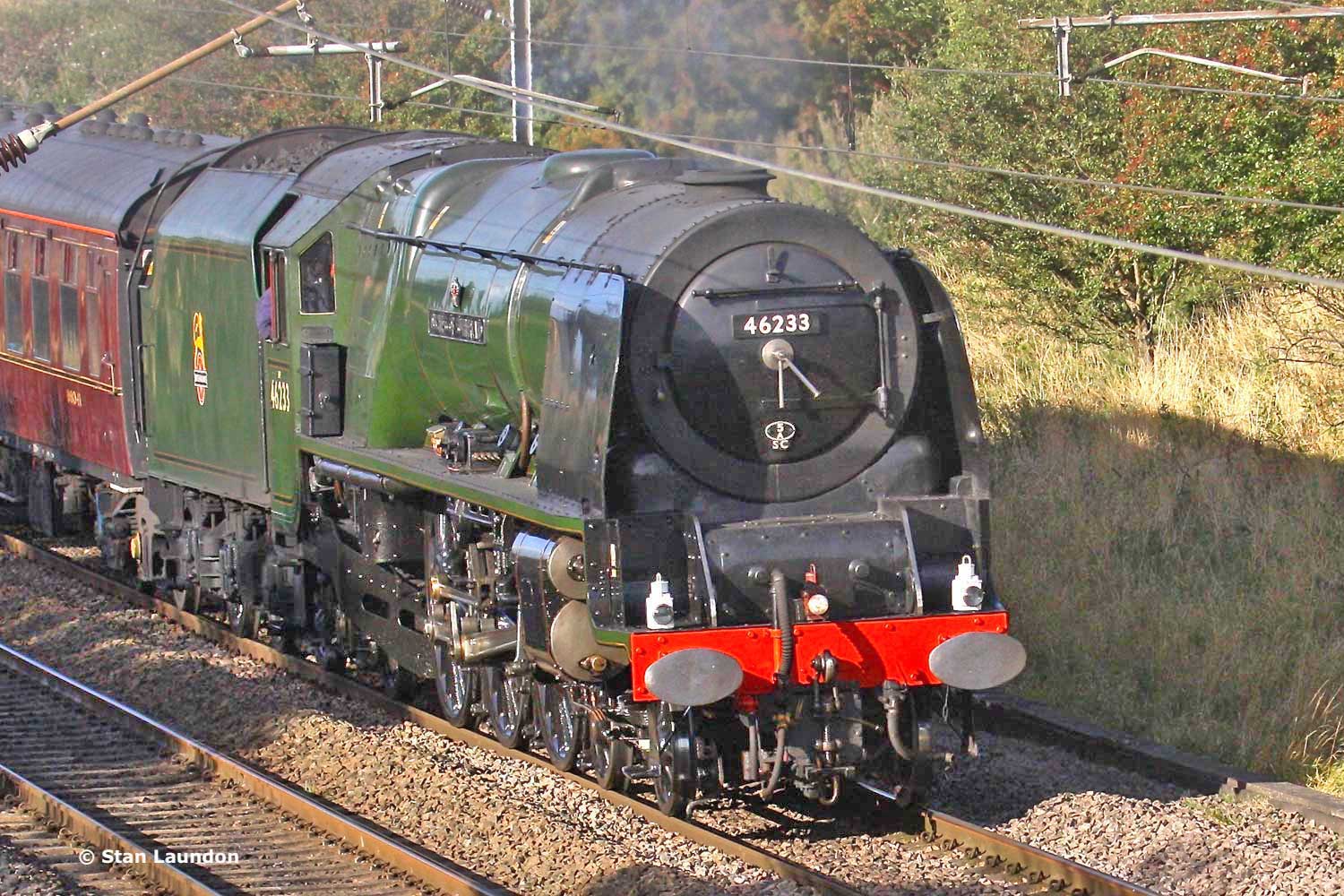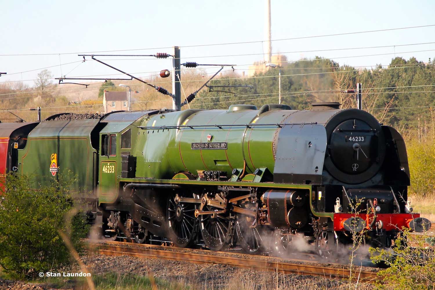 The LMS Coronation Class (4-6-2) 46233 "DUCHESS OF SUTHERLAND" was on an excursion on Saturday, April 19th, 2014 hauling “The North Eastern” between Newcastle and Derby. Steam fans enjoyed a close-up view as she stopped at Ferryhill (seen here) for more than half an hour. Sadly, she was delayed on her journey southbound and those enthusiasts, waiting at Bradbury, did not get to see her as, I’m told, she went off on a branch line towards Sedgefield.