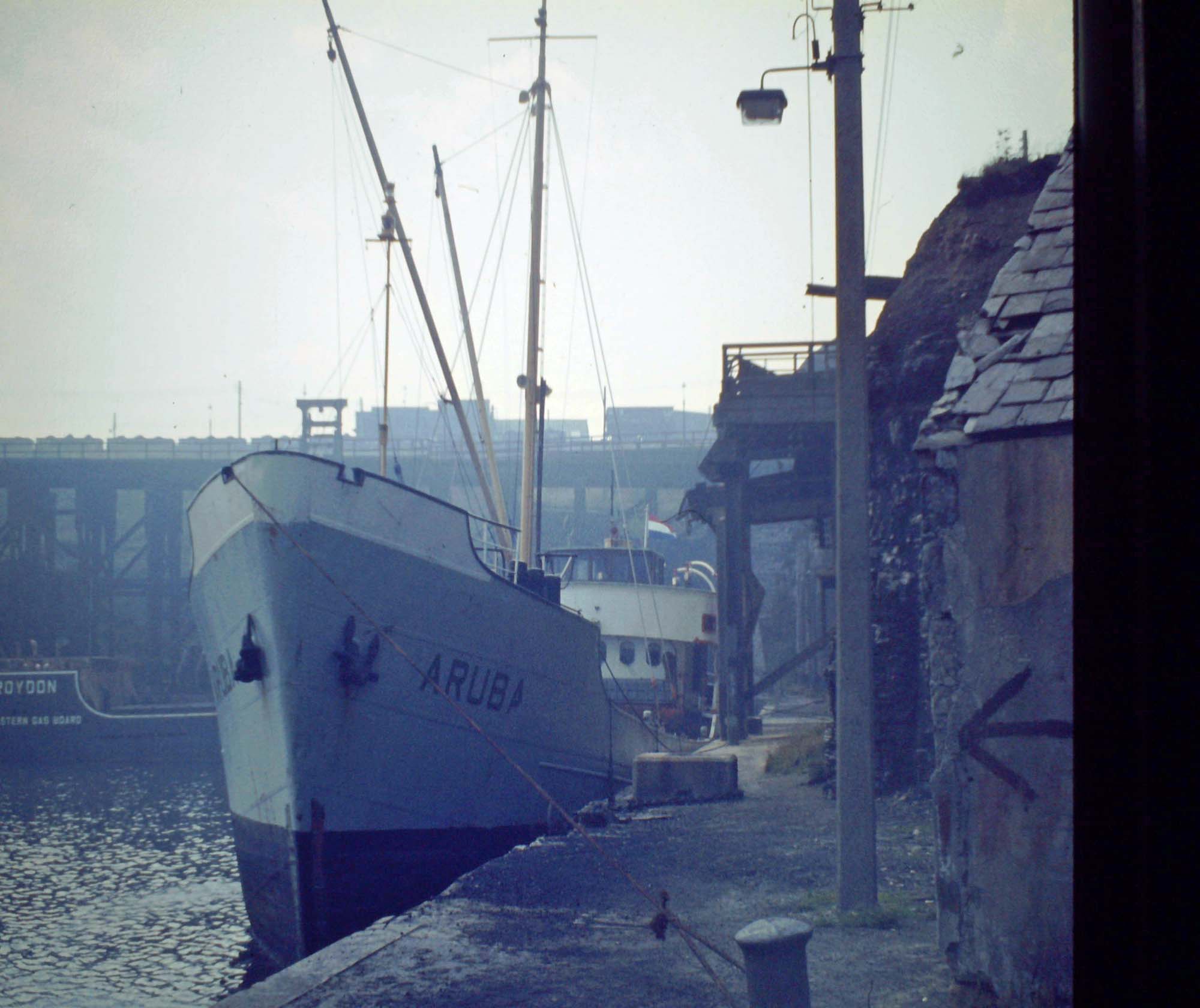 Another view of Eppleton Hall. Mv Aruba 455 grt M Havinga Scheepvaart & Handelmaats at Seaham July 1967 in the days of the drops. The flat iron Croydon of South Eastern Gas Board visible in the background under the drops.