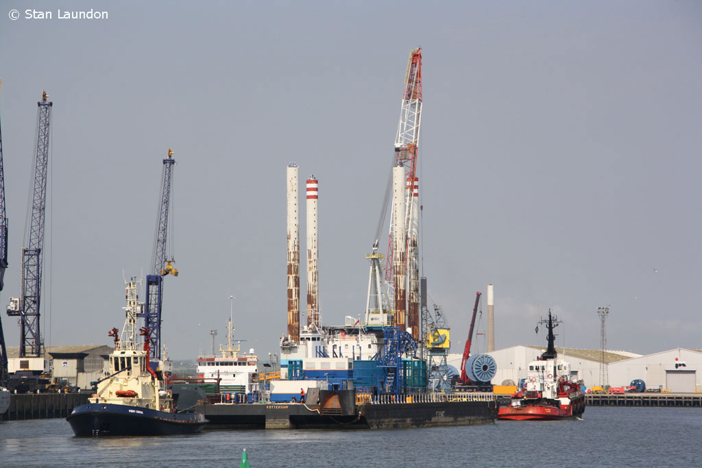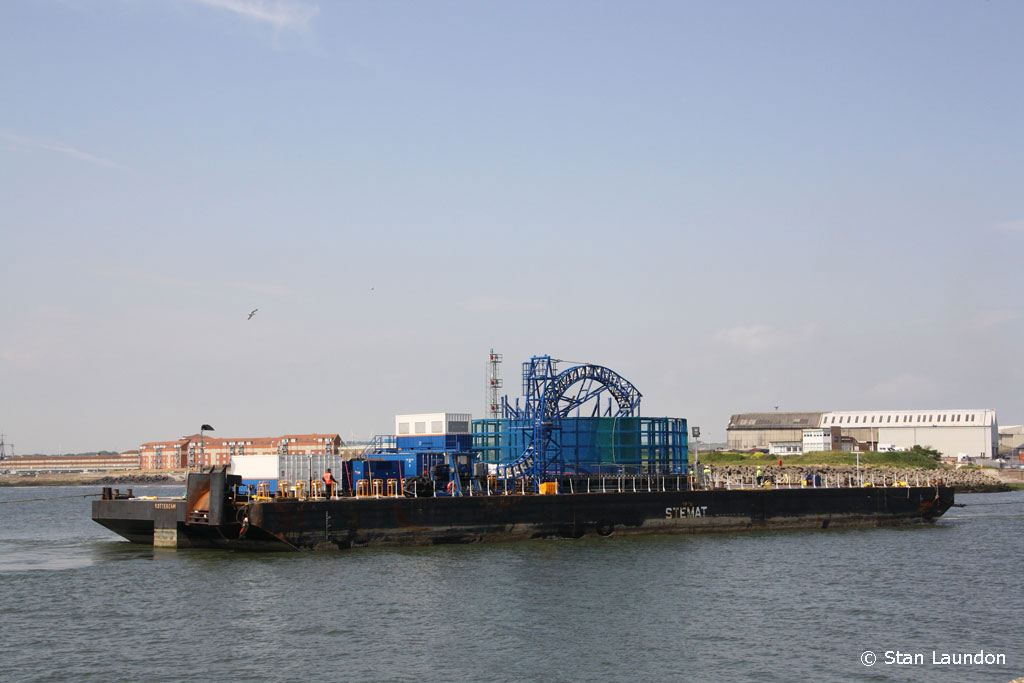 The STEMAT 87 arriving in Hartlepool. She had the EUROSUND at the bow and the FIERY CROSS at the stern.