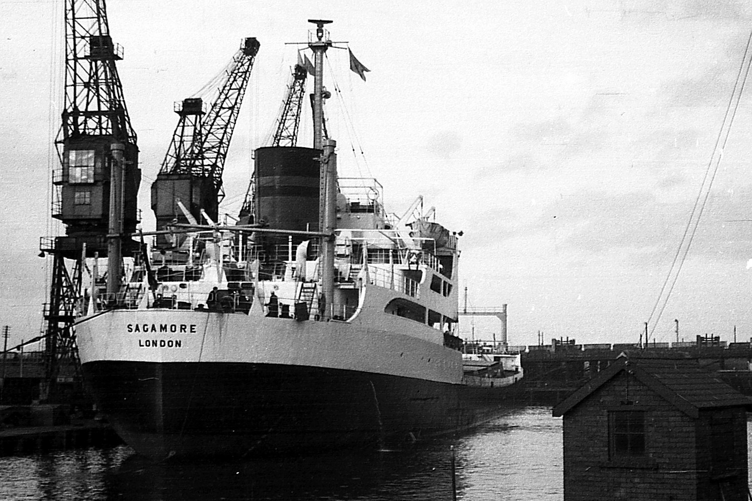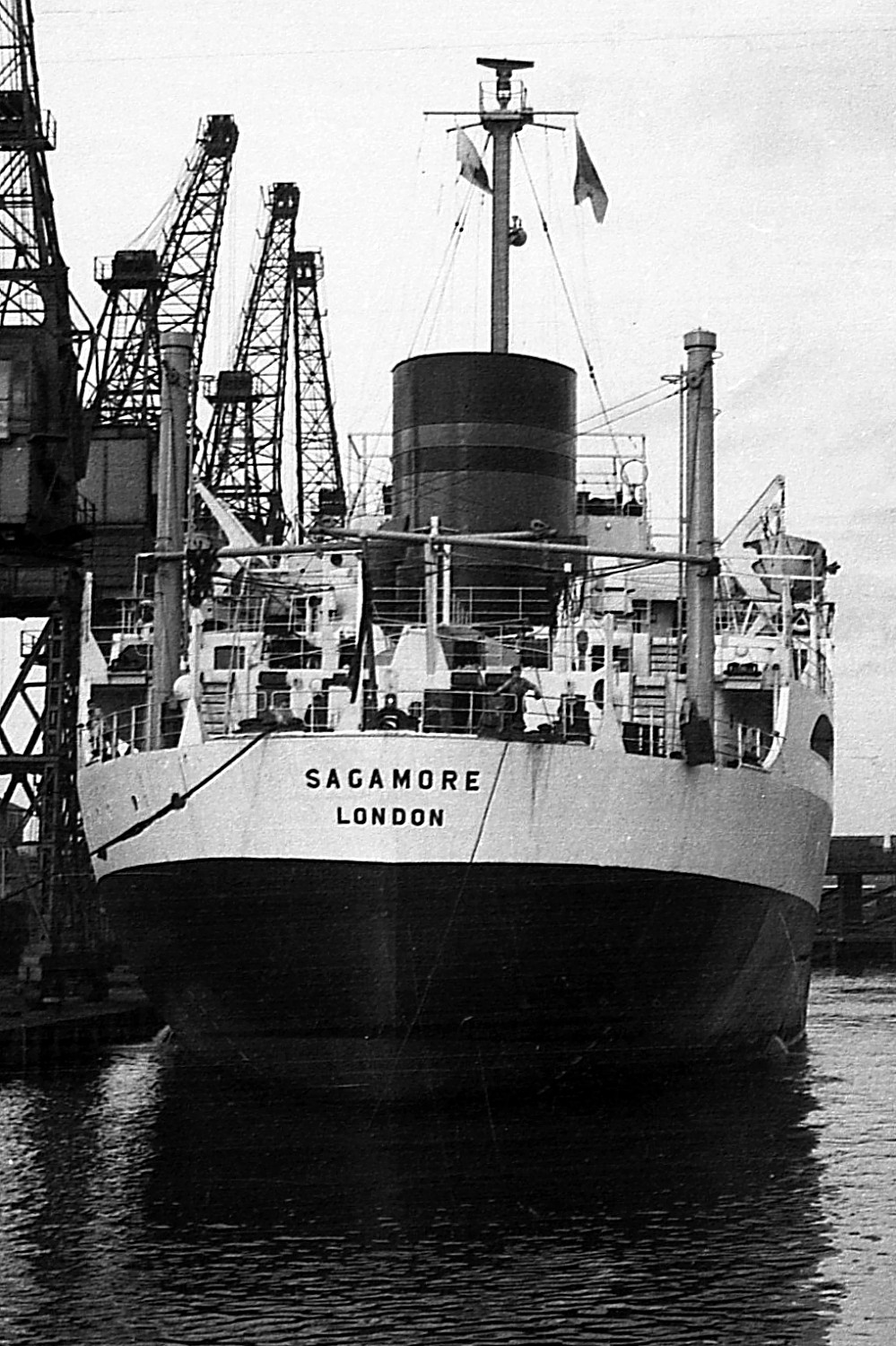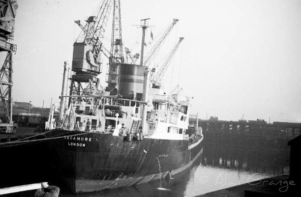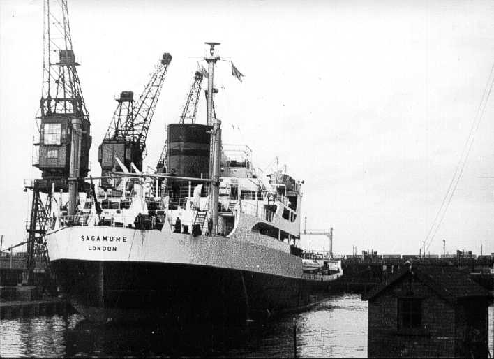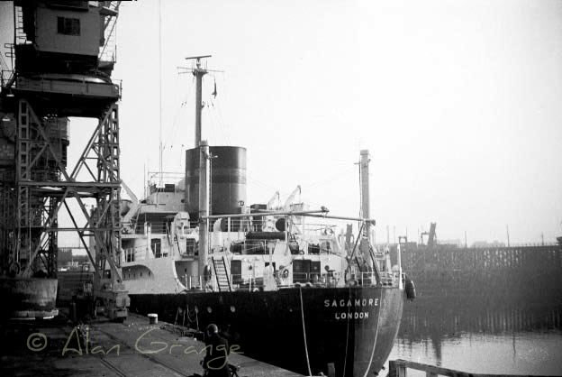 A friend of mine sent me these two photographs. They are of "Sagamore" in the Victoria Dock taken in 1967 by Alan Grange who says: "They were taken from Central Road, by the swing bridge, looking across the Old Harbour with the North Basin behind me on my way from Throston Bridge to Richardsons & Westgarth. "In the rear you can see the now demolished Coal Staithes".
