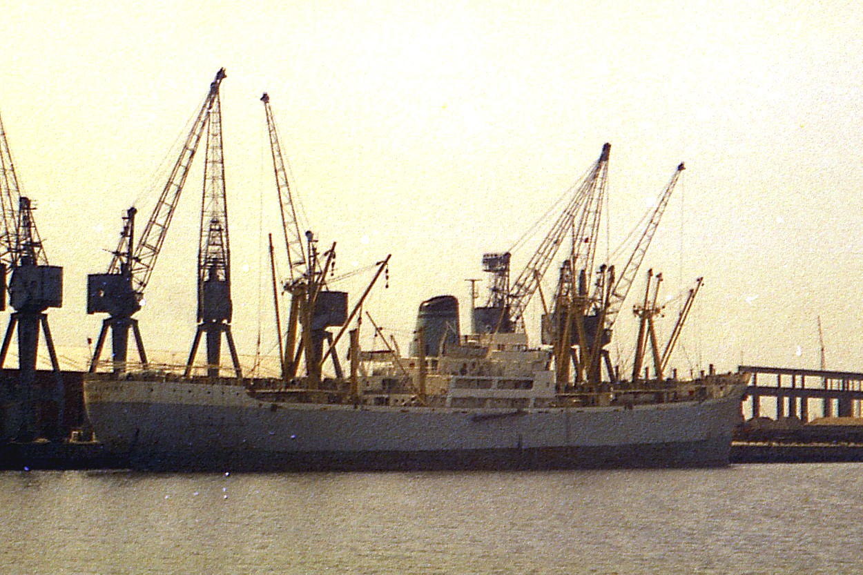 Albert Weller slides in Tees Dock. Two on board during a ship visit circa July 1974: