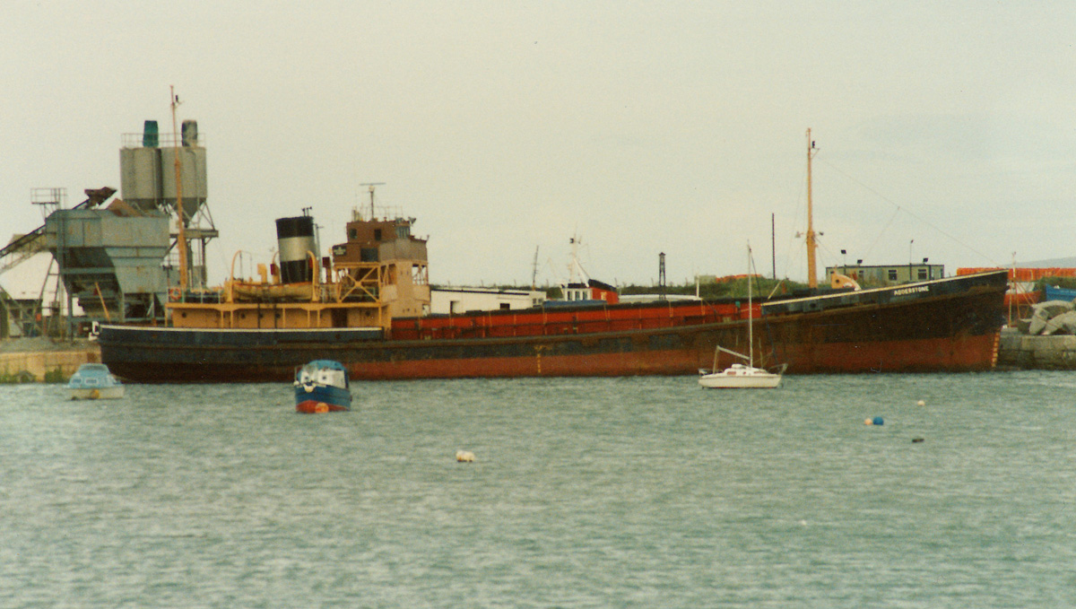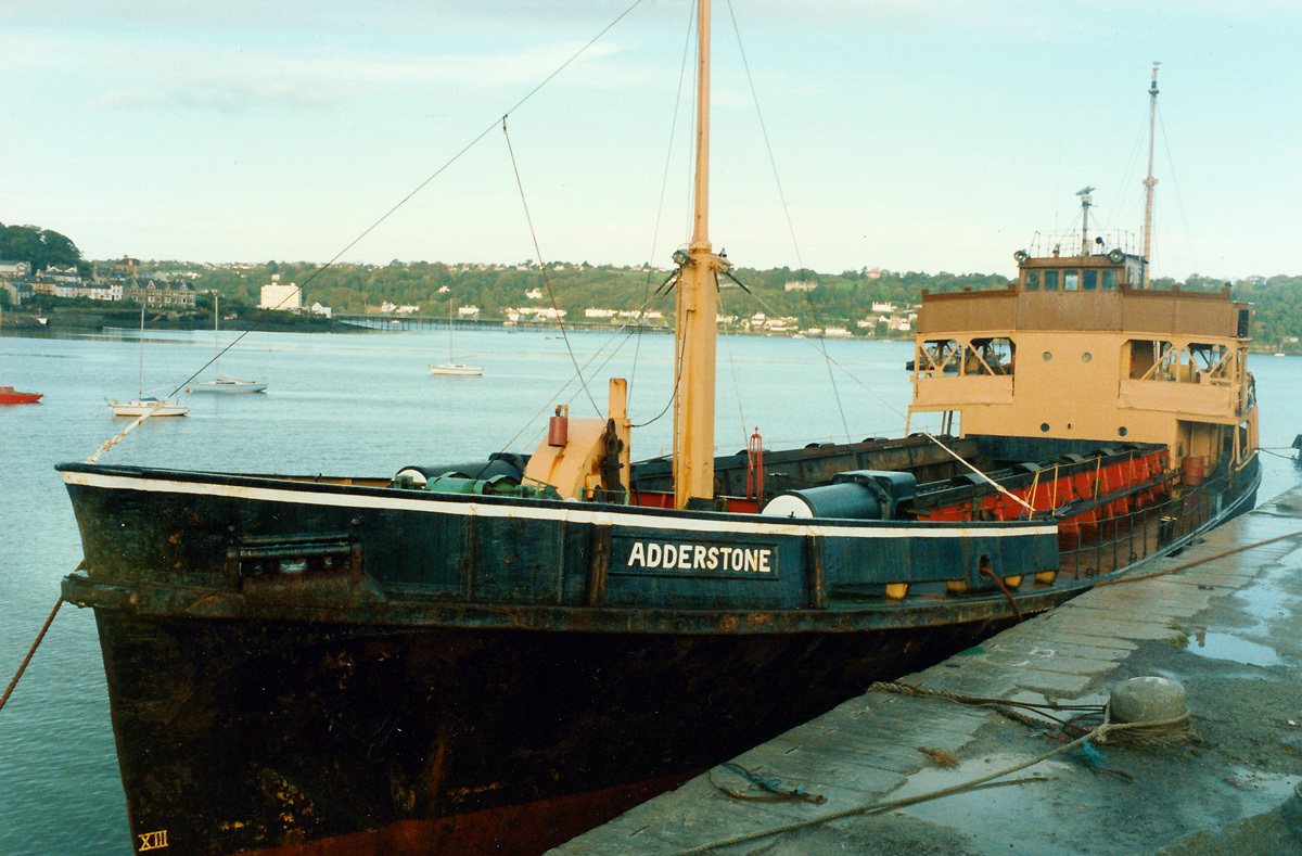 It was SIR FON and SPRINGWOOD that were built for the new power station at Bromborough on the Wirral, but in a late design change, Bromborough ended up as oil fired rather than coal fired so the vessels were re-allocated. I don't know the significance of the name SPRINGWOOD, but here she is as ADDERSTONE laid up in Port Penrhyn, N. Wales 23/10/1989. However I think she had already been sold to S. Evans, Garston for breaking, but she didn't get there till 3/1992.