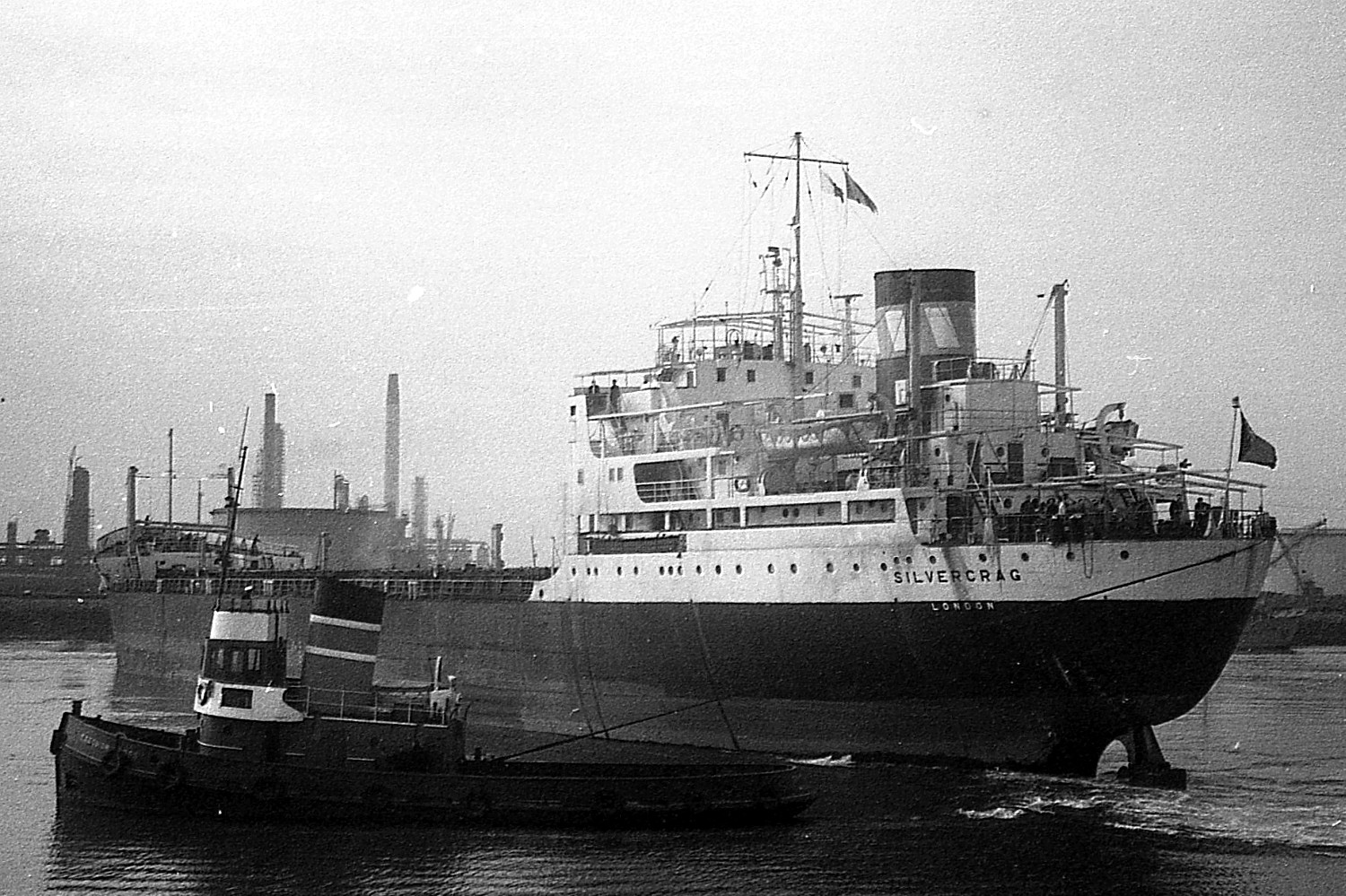 The SILVERCRAG, assisted by CAEDMON CROSS, berths in the Tees. Albert Weller Negative Collection: