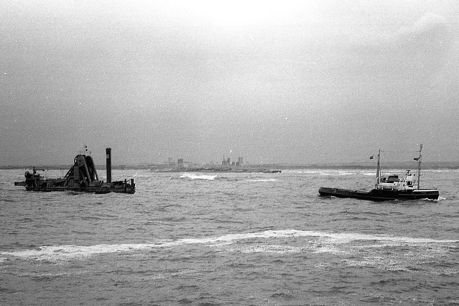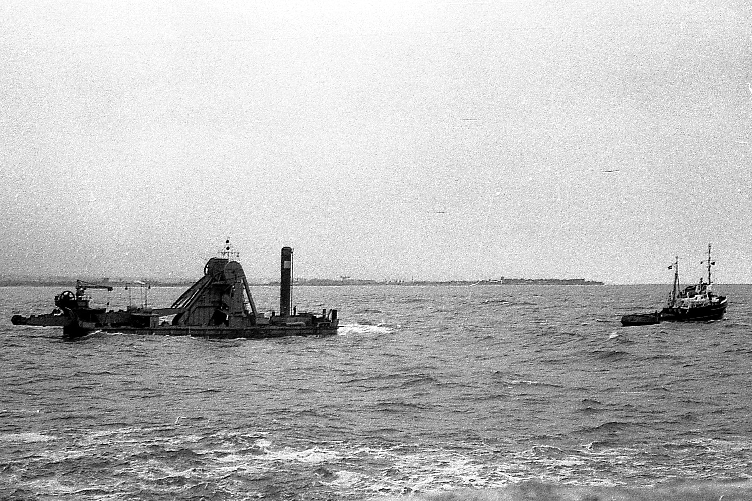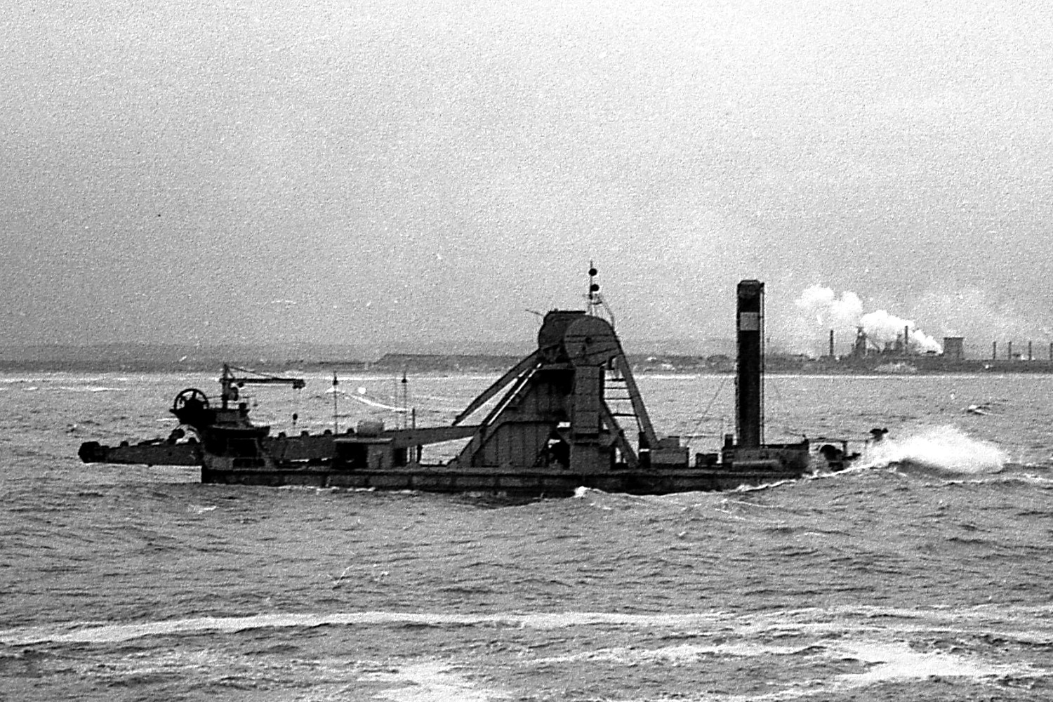 Greatly enlarged images from Albert Weller negatives of the MAAS and an unidentified bucket dredger in choppy conditions in Tees Bay.