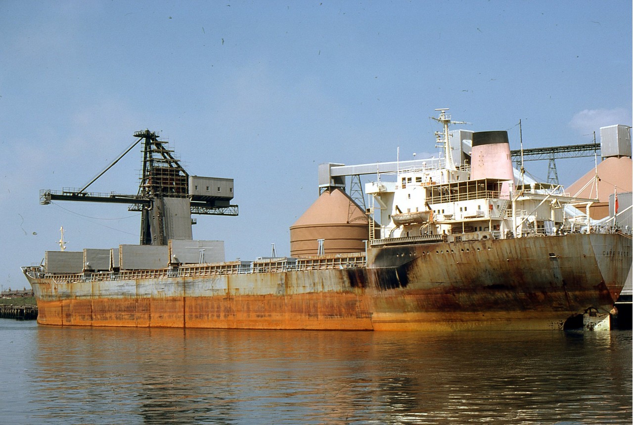 Cargoes other than alumina and bauxite were occasionally carried but due to the condition of the ships holds they weren’t cleaner commodities such as grain although in November 1975 the Cape Race loaded a full cargo of soya beans in Norfolk Va. for Santander. Petroleum coke was sometimes carried.