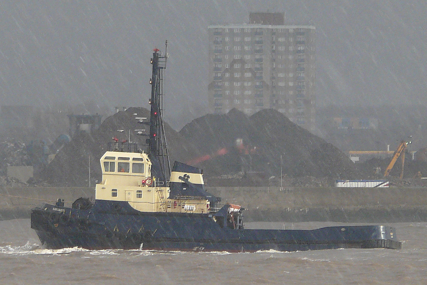 Sunshine and rain only minutes apart in these successive views! Taken from New Brighton. There, In a fairly short space of time we witnessed quite a number of the different elements of nature. For a start, it was cold, it was windy – they were the invisible elements, but we could see how choppy the sea was on the incoming tide and how some of the smaller ships and tugs were rocking and rolling even in the relative shelter of the river mouth. We saw a succession of changes in the weather, all lasting only minutes rather than hours – it rained (witness the OAKGARTH photo above where the raindrops can be seen slashing across the image, even in the mere 1/200th of a second or so that the shutter was open); it hailed (if only for a couple of minutes); it was cloudy, it was foggy, it was sunny, we enjoyed a rainbow, and several of the sequences I shot showed ships encountering all of these things over a period of 15 to 20 minutes that they were in view. And, eventually, when we decided we (or I!) had seen enough, it came over really dark and the heavens opened! What was it I said – two and a half to three hours to get home? Six and a bit hours later we did get home, after being stuck on the top of the M62 for three hours as a consequence of part of the motorway being shut for a while because so many cars had broken down in the snow that had by then fallen across the Pennines! That was surely our penance for me indulging myself that day!!!