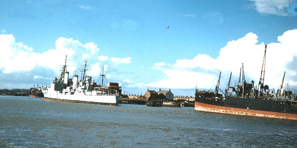 I'm reasonably certain the ship on her inside is called SUNRISE. She was laid-up at Blyth for a while and I have a picture of ALAUNIA with her in the background so the Cruiser is probably HMS GLASGOW which arrived in late 1958.