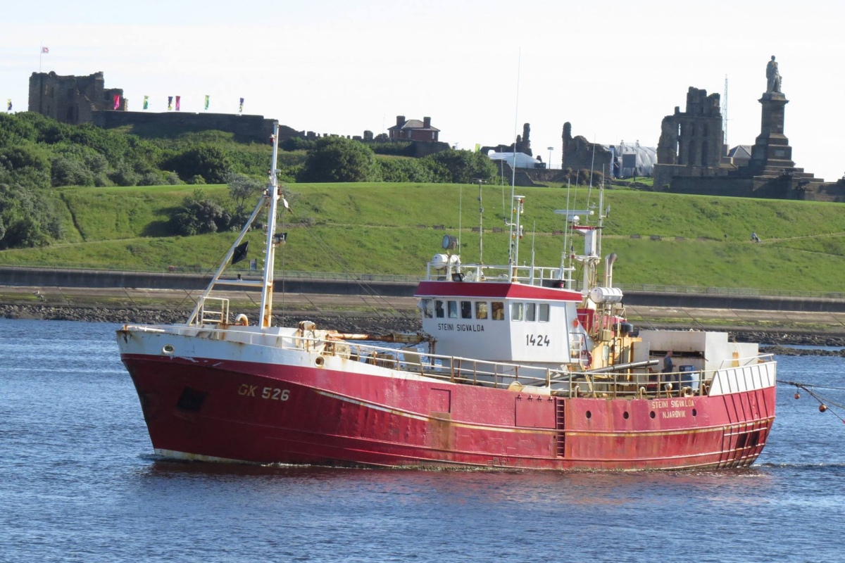 Icelandic fishing vessel STEINE SIGVALDA inwards past Tynemouth headland towing country mate TJALDANES - GK525.