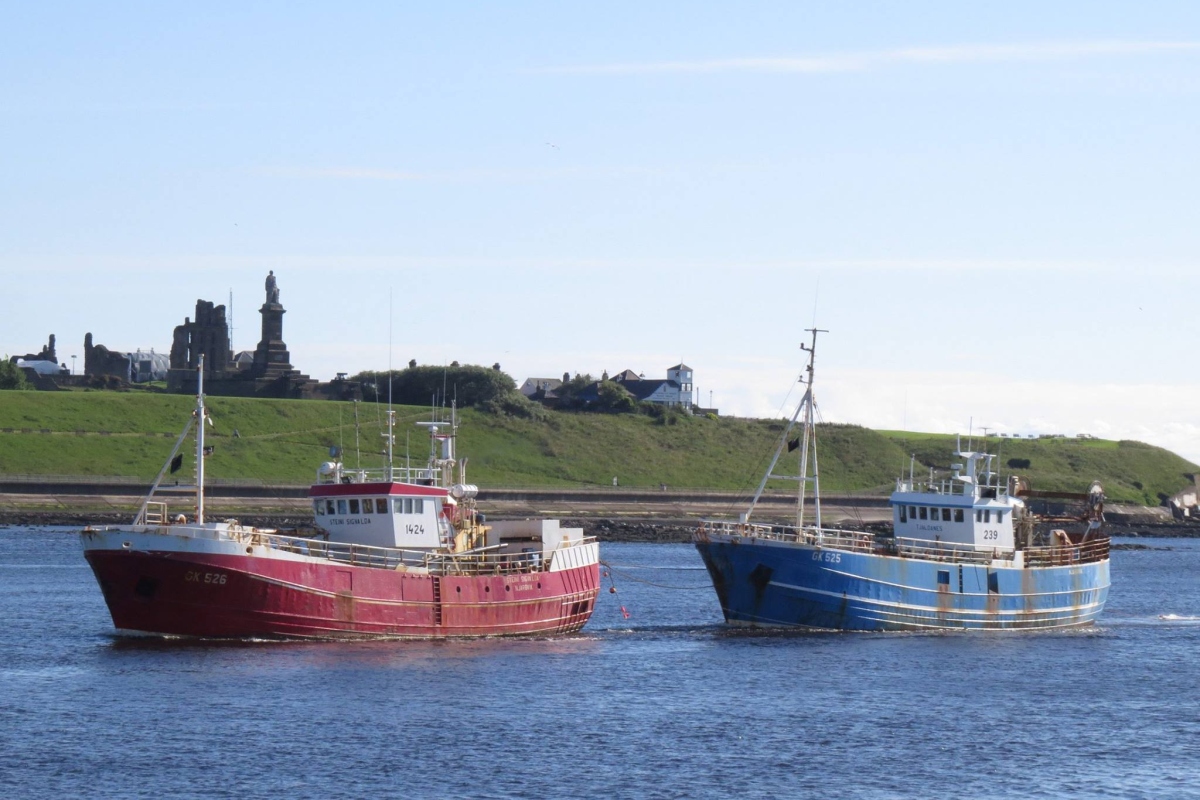 Icelandic fishing vessel STEINE SIGVALDA inwards past Tynemouth headland towing country mate TJALDANES - GK525.