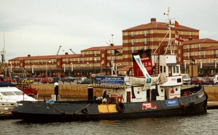Seems she has broken away from her mooring buoy more than once in the past, presumably there is no-one on board. Still displaying her 'HMRT' Her Majesty's Rescue Tug logo!!