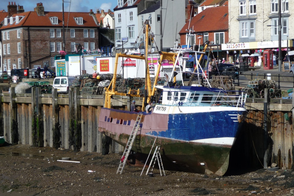 Shoreham fishing boat CHARELLA - SM799 getting a new coat of paint in Scarborough harbour 19/09/2017